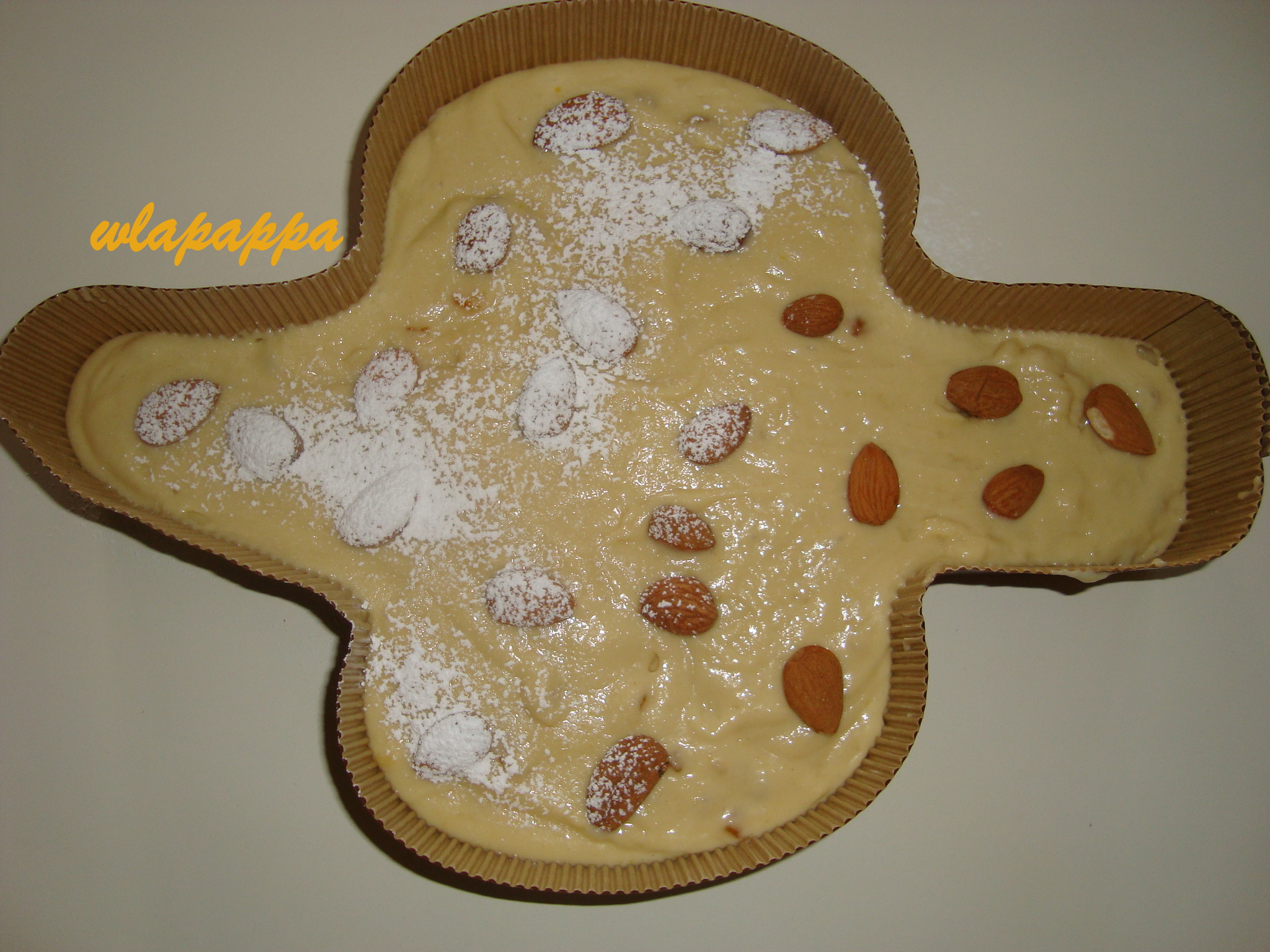 "antiorario" vel,. 2Versare l'impasto in uno stampo da colomba, aggiungere le mandore intere e spolverare con zucchero a velo.