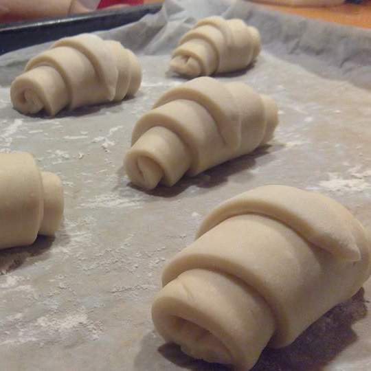 Posizionare i cornetti su una teglia spennellare la superficie delicatamente con il rosso d'uovo e cospargete di granella di zucchero e lasciar lievitare una nottata intera (minimo 8 ore).