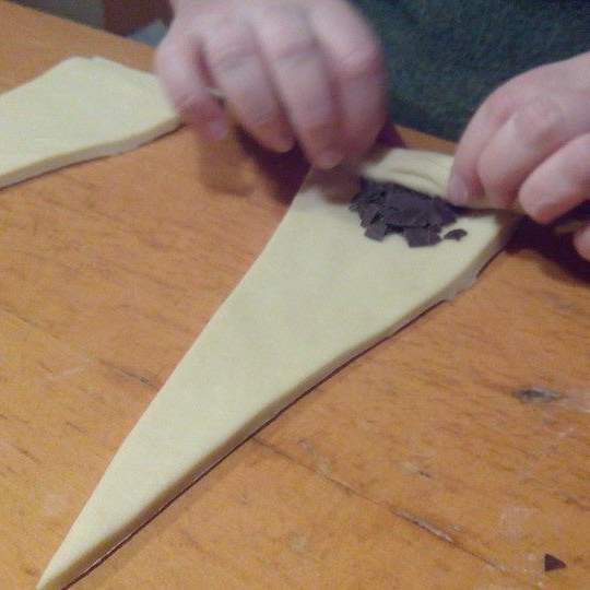 Tagliate a spicchi e arrotolate ogni spicchio dalla base larga fino alla punta stretta. Nella fattispecie io ho usato delle scaglie di cioccolato fondente.