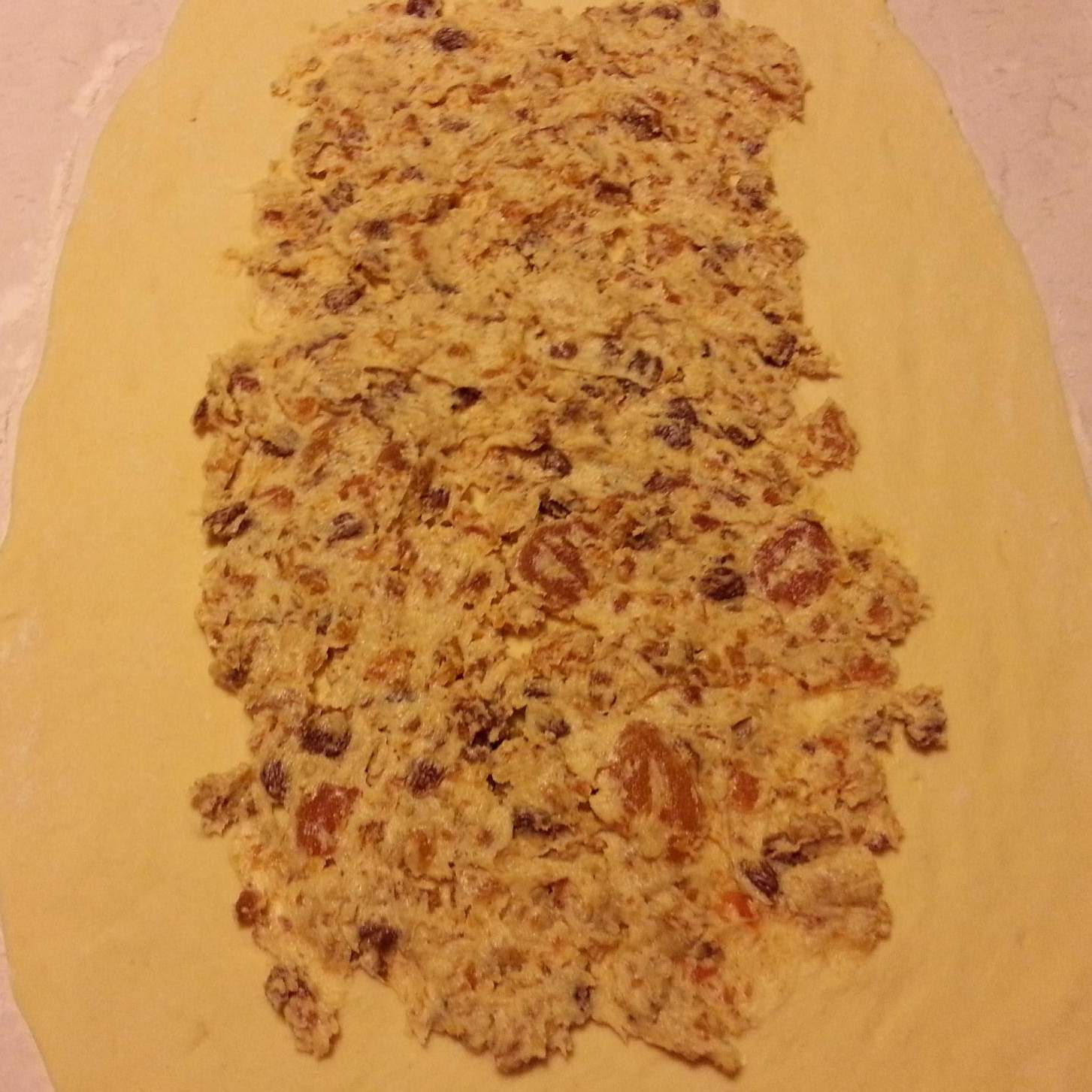 Stendere la pasta ad ottenere un rettangolo di circa 25x35 cm. Stendere uniformemente sulla pasta il ripieno e arrotolare stretta la pasta dal lato lungo. Poi tagliarla a metà sempre nel senso della lunghezza, lasciando un capo unito per aiutare ad intrecciare i due pezzi di pasta ottenuti. Il procedimento in pratica è quello dell'angelica dolce. Intrecciare i due pezzi sino alla fine, poi unire le due estremità ad ottenere una corona. Metterla sulla placca forno rivestita di carta forno e cuocere per 25 minuti a 180°.