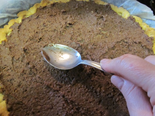 riempire la base di frolla con questo ripieno, livellare bene e mettere in frigo per 3 ore.