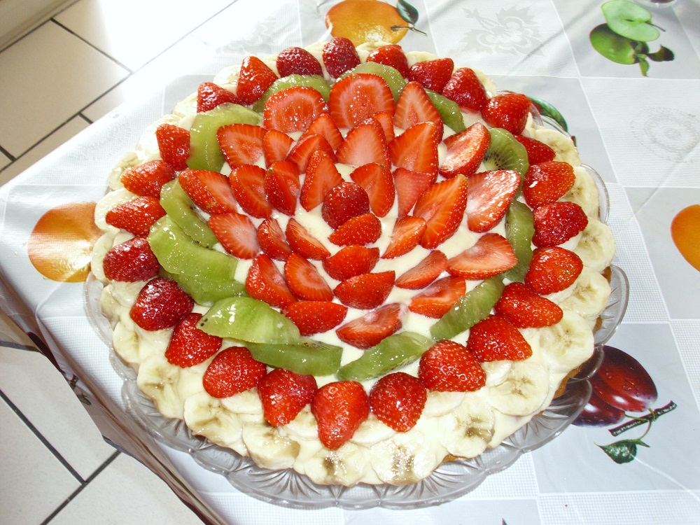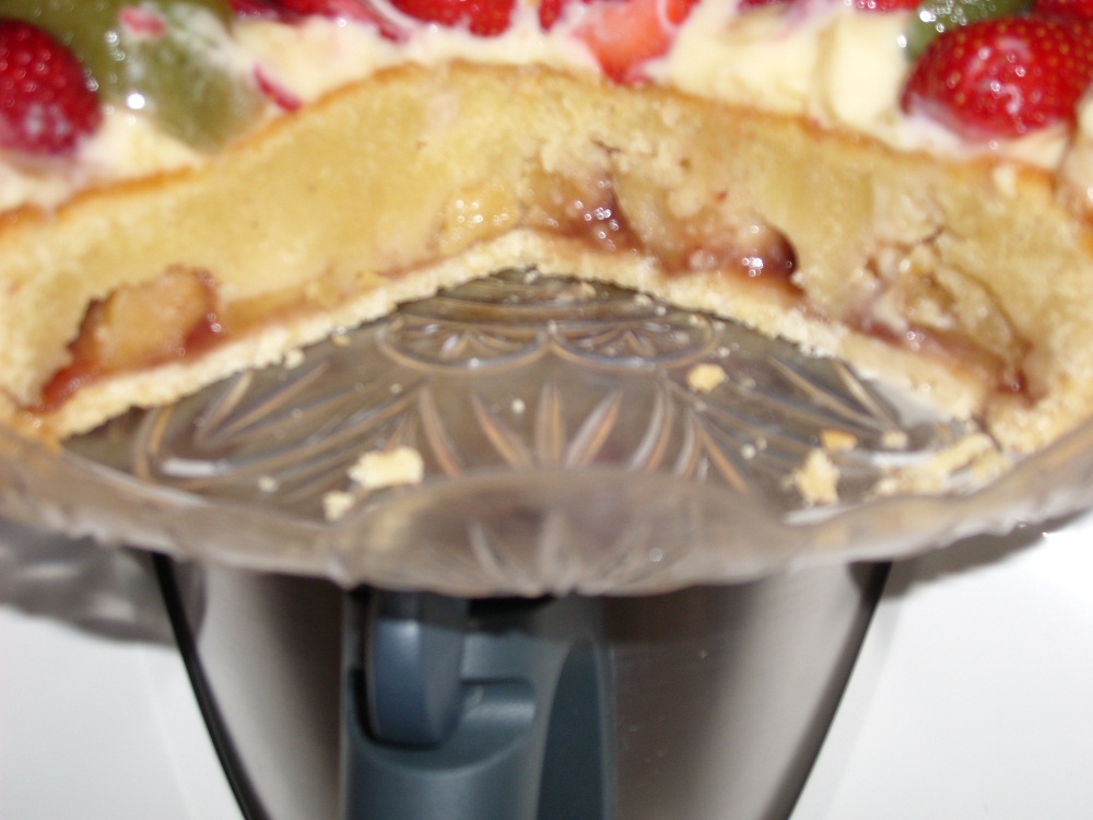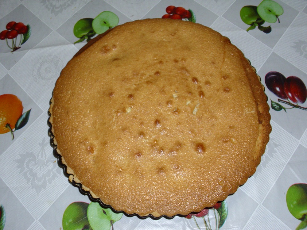sulla superfice della torta fare uno strato di crema pasticcera (NB LA DOSE DI CREMA PASTICCERA DEL LIBRO BASE è TANTA, IO NE HO USATA 2/3 CUCCHIAI, LA RIMANENTE CREMA LO UTILIZZATA X ALTRO)