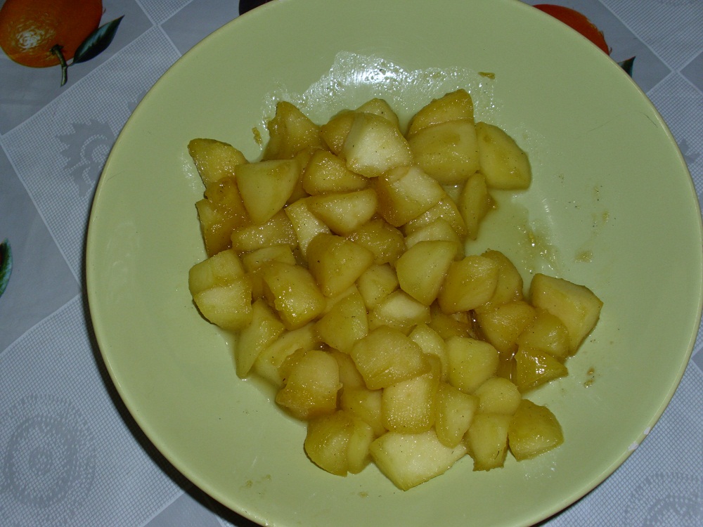 sbucciare le mele privarle del torsolo e fare a tocchetti non troppo piccoli ,mettere da parte ,
