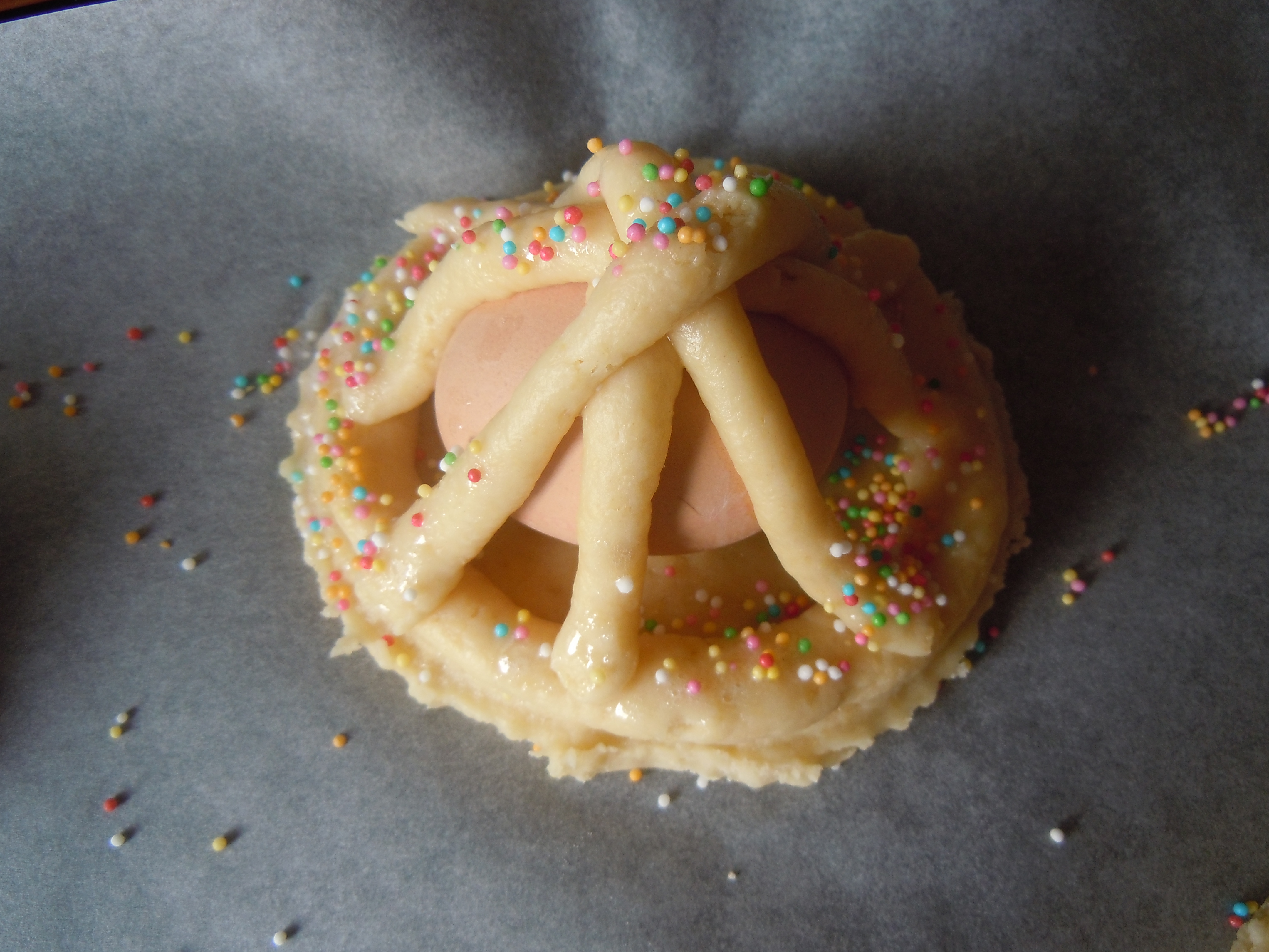 Stendete l'impasto col mattarello dello spessore di circa 1/2 cm e ricavate le forme che piu' vi piacciono e su cui poggerete un uovo sodo "ingabbiato" con delle strisce d'impasto.