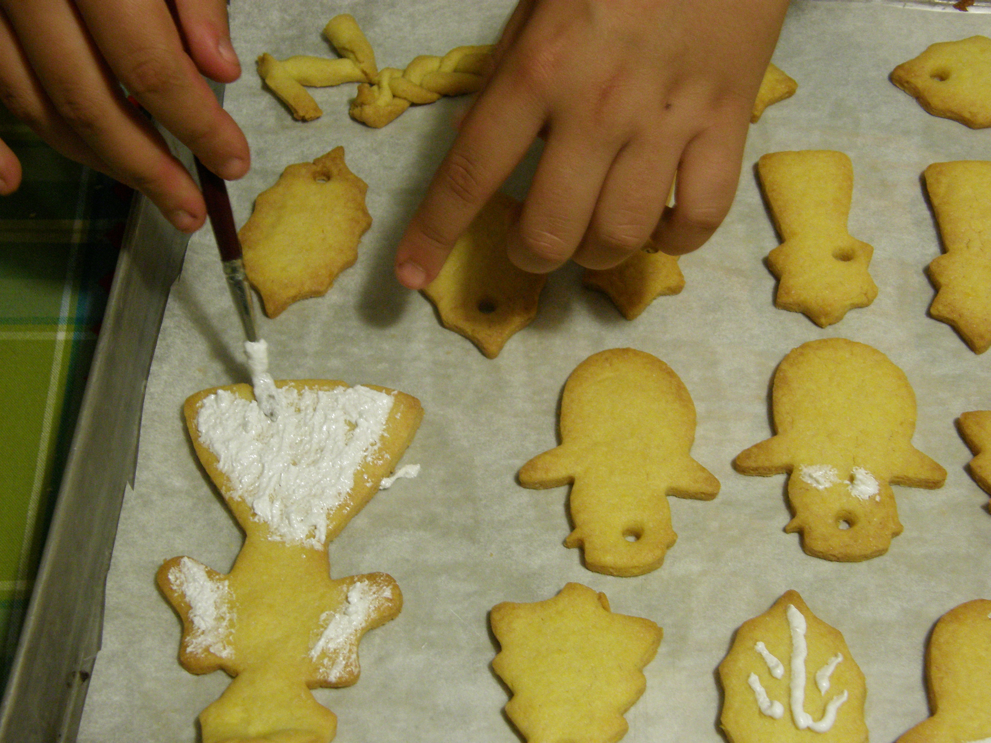 Standere una sfoglia di mezzo centimetro e, con le formine, ricavare tanti biscottini. Ricordate di fare un foro ai biscotti prima della cottura cosicchè potrete infilarli con un nastrino ed appenderli. Noi li abbiamo bucati con una siringa (proprio quella delle iniezioni, ma senza ago).