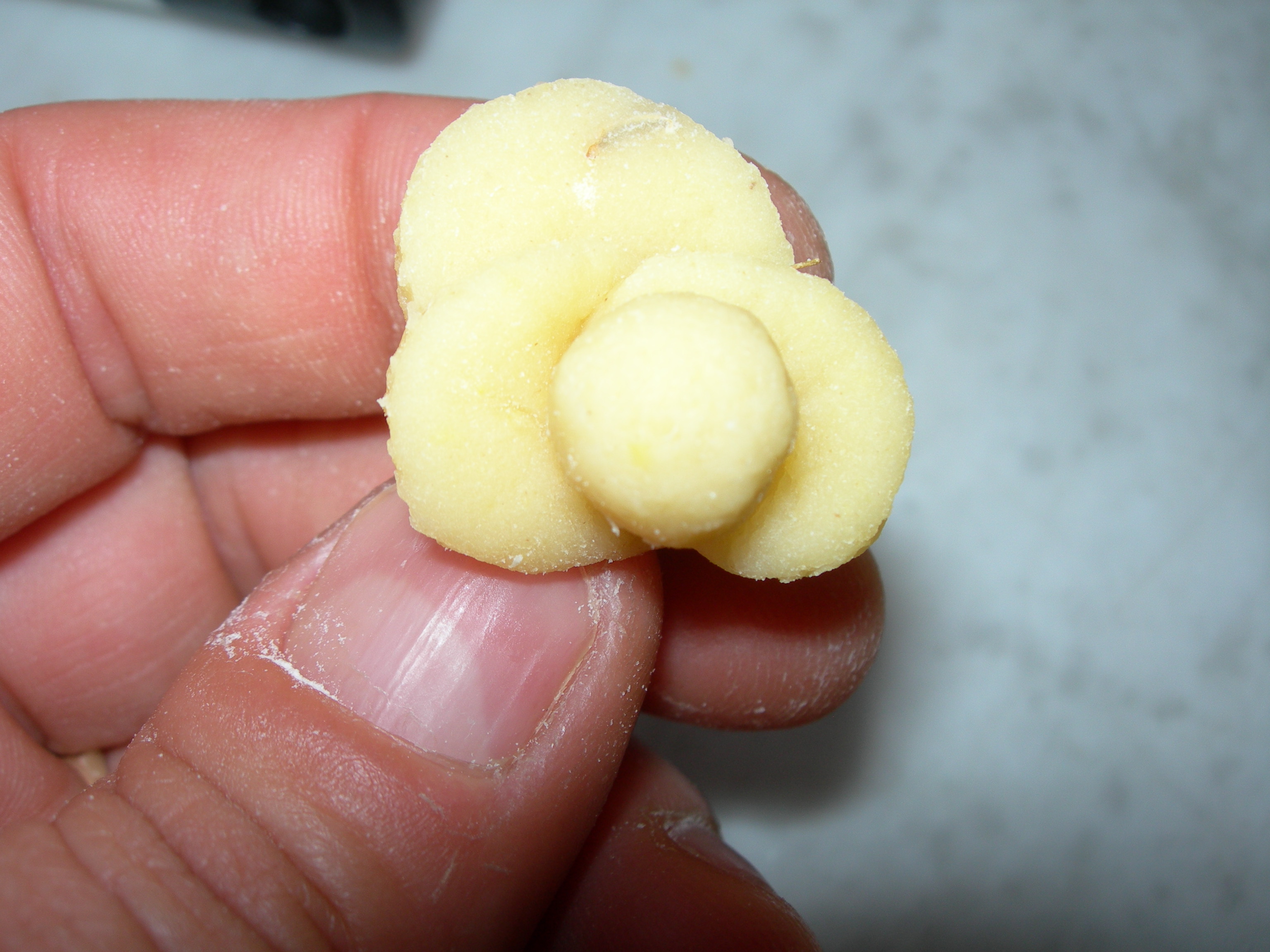 Pizzicare sotto il dito la pallina di impasto e facendola rotolare sul piano lavoro, formare un gambo sottile (fig. 9), tagliare ora con l’ausilio di un leva torsoli tanti piccoli cerchi (fig. 10), questi saranno i petali e ne serviranno 5-6 per ogni rosellina. Con un dito schiacciate un lato del petalo (fig. 11), accostarli uno ad uno alla pallina con gambo e formare la rosellina (fig. 12), appena è pronta farla aderire alla base precedentemente tagliata e proseguire con altre roselline.