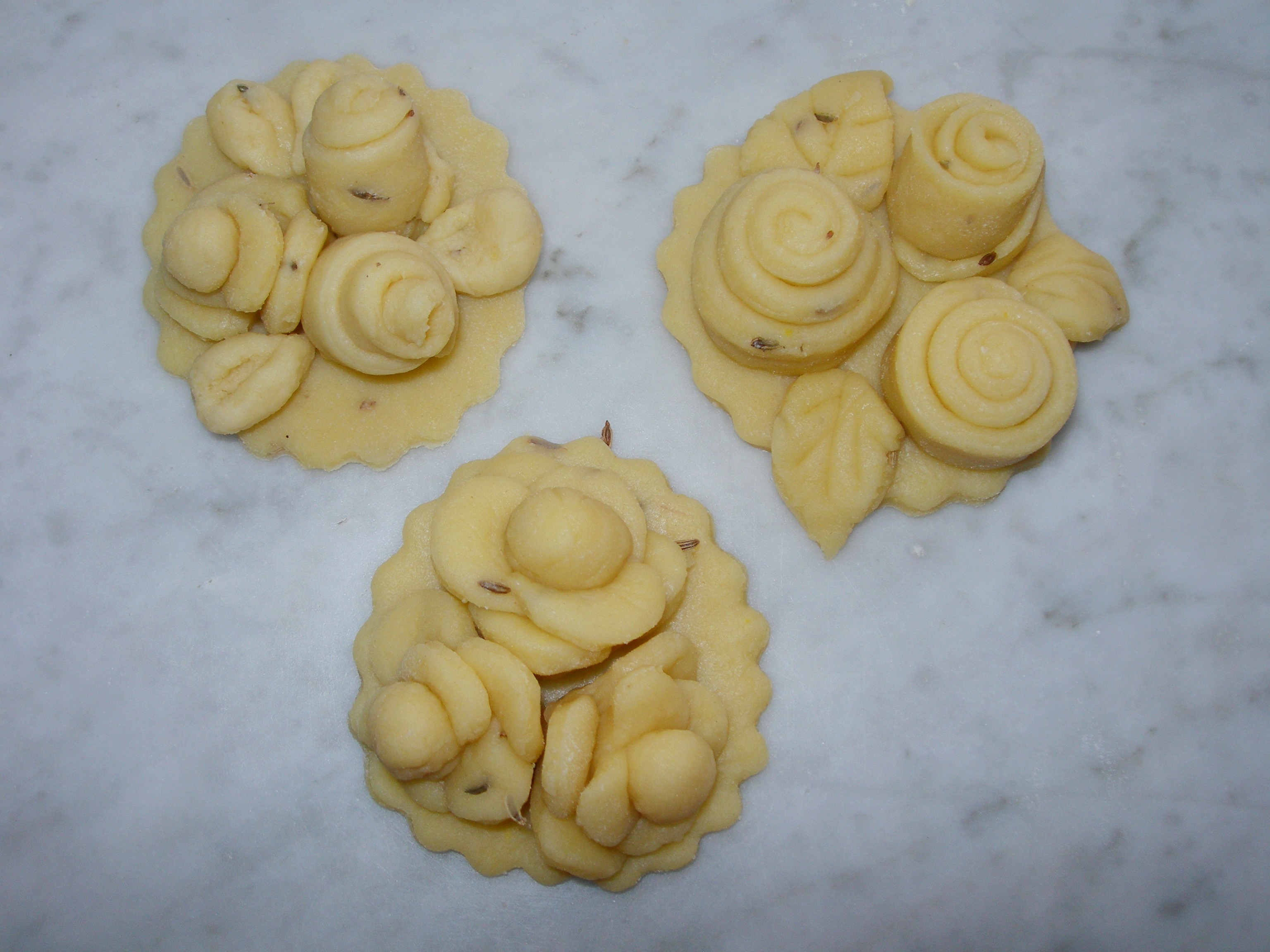 Stendere l’impasto come sopra indicato, tagliare delle strisce lunghe circa 10 cm e larghe 1 e arrotolarle su se stesse, farle aderire alla base precedentemente tagliata, completare con foglie di impasto tagliandole a piacere.