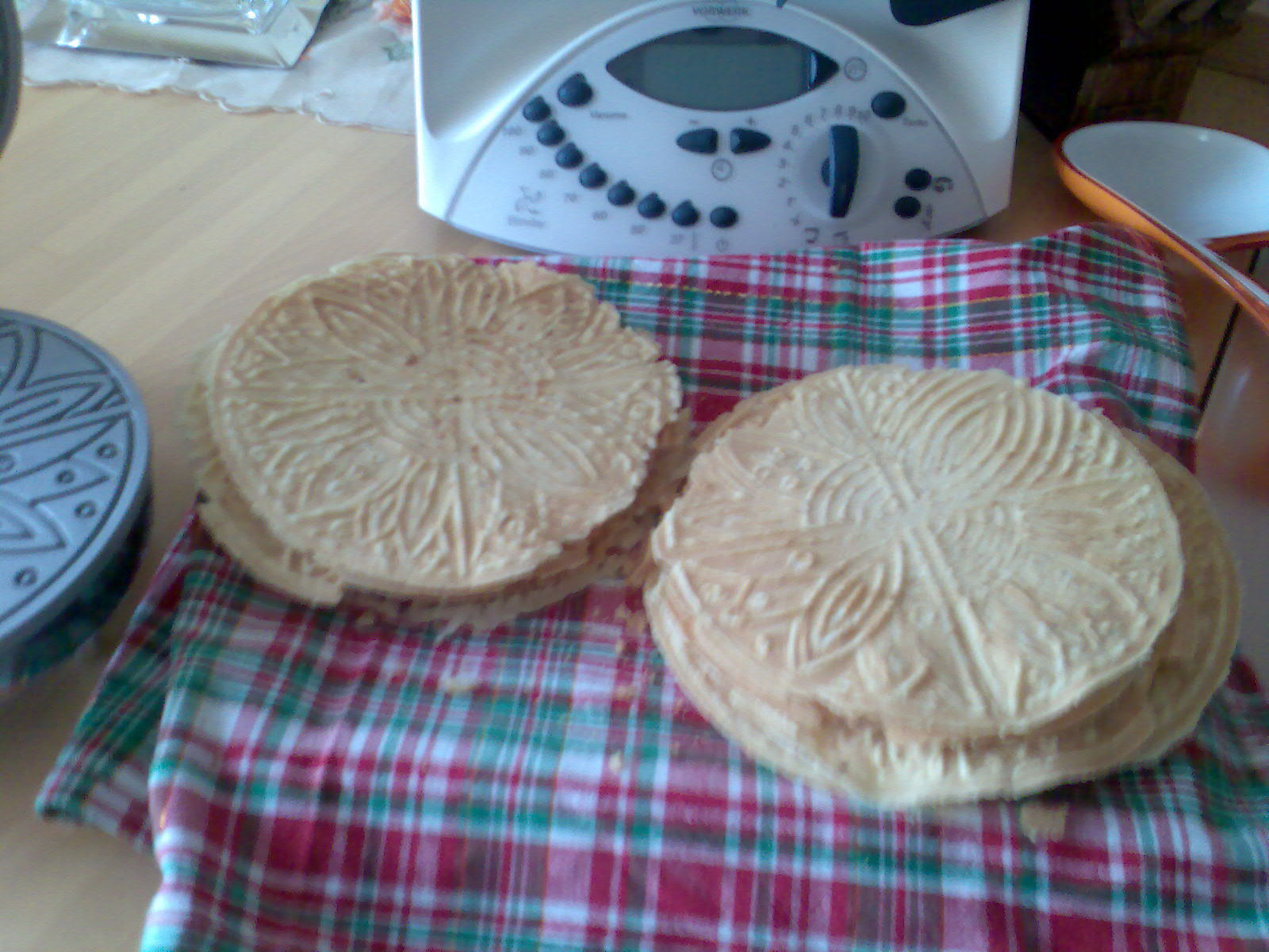 .Prendere un cucchiaio di impasto, (che deve essere piuttosto liquido) metterlo al centro dell'apposito attrezzo,chiuderlo e porlo sul fuoco girandolo sui 2 lati per pochi minuti, oppure usare l'attrezzo elettrico.