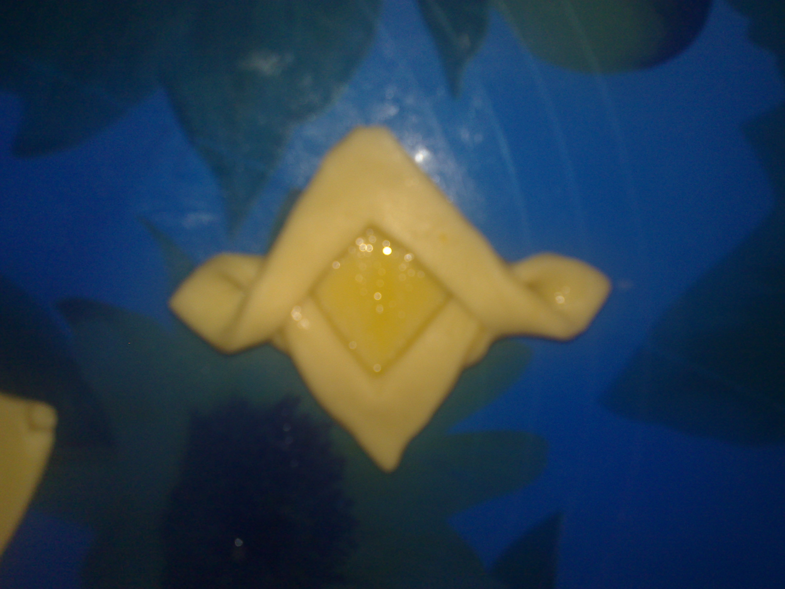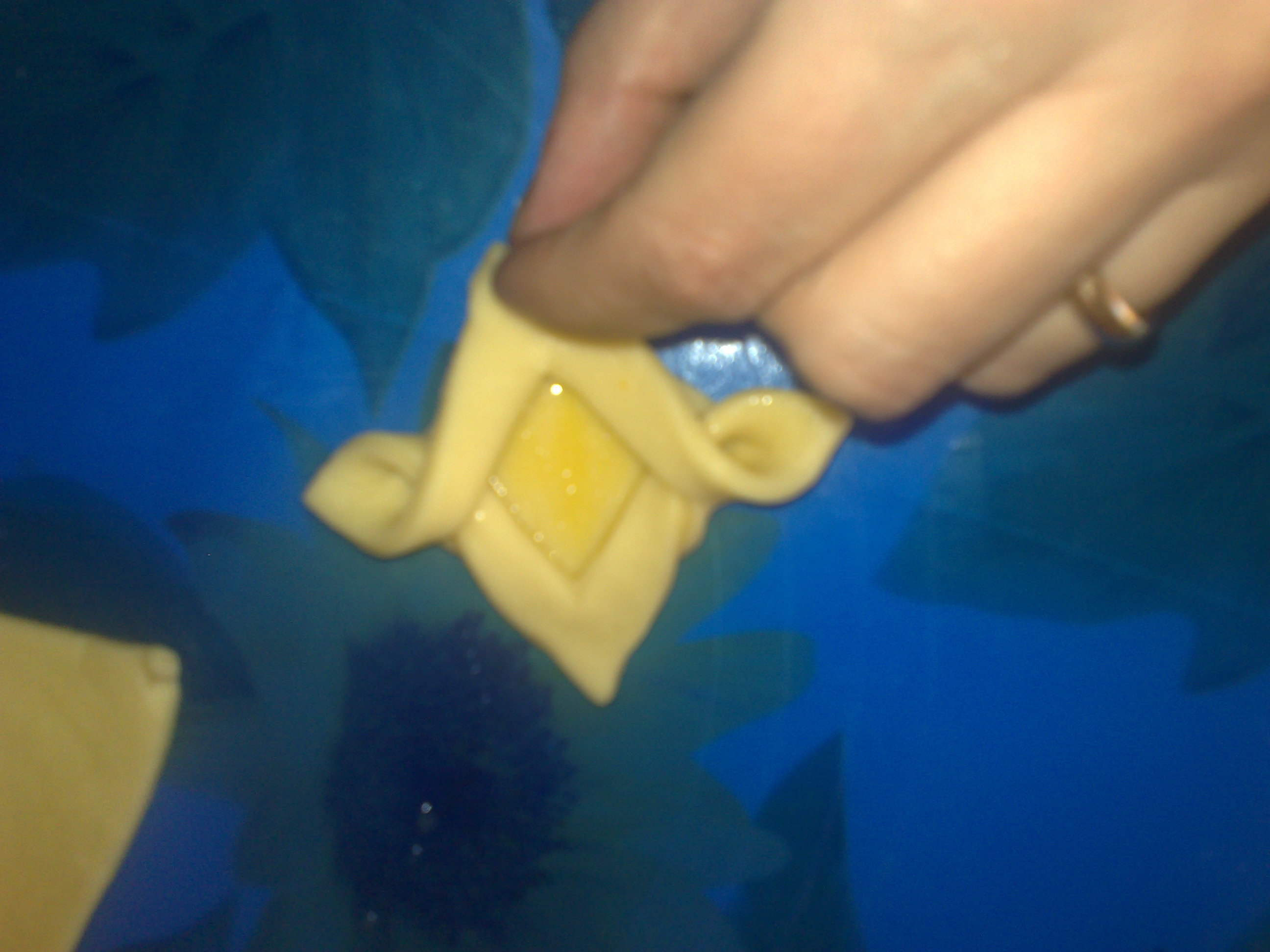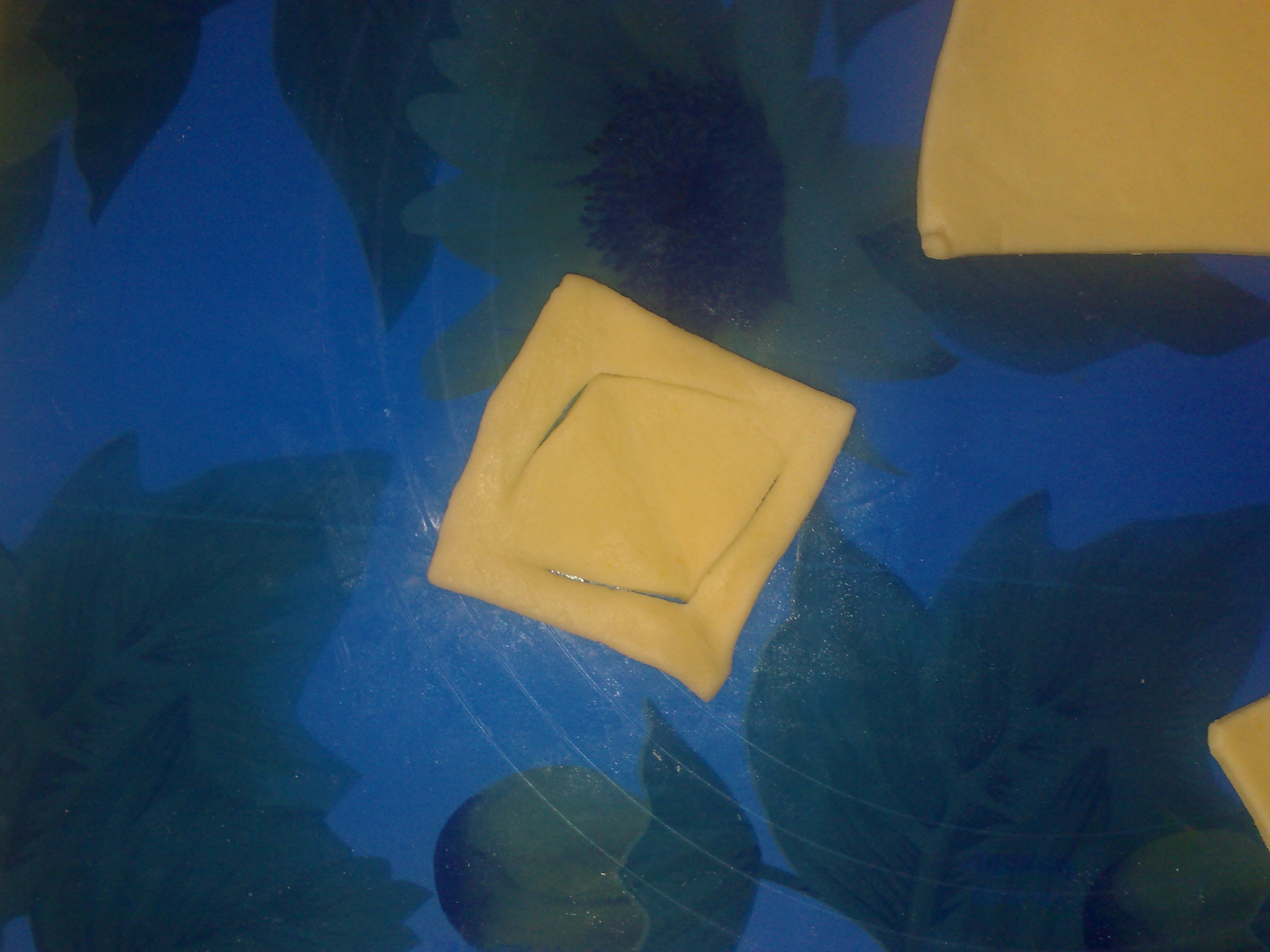 Dopo la lievitazione prendere un pezzo di pasta (lasciando l'altra coperta) e stirarla con il mattarello allo spessore di 3-4mm.Riportare la forma disegnata. Prendere un quadrato di pasta e piagarla in modo da formare un triangolo, fare 2 tagli sulle lunghezze laterali (partendo dalla base)lasciando pochi mm all'incrocio delle 2 lunghezze. Aprire il quadrato così ottenuto e spennellare con poco uovo preparato. Prendere le 2 estremità aperte con 2 dita e fare entrare l'una nell'altra.Spennellare il fiocchetto ottenuto e mettere al centro un cucchiaino di marmellata. Sistemare in una teglia con carta forno. Infornare in forno già portato a temperatura a 180° per 10 min. Se il vostro forno è alto cuocere invece a 150° sempre per 10 min. Lasciare raffreddare e servire