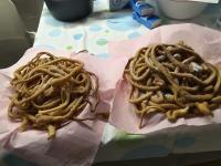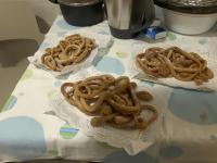 - Scaldate dell'olio in una casseruola capiente e tramite un imbuto, o una sac a poche versate l'impasto nell'olio fumante formando delle spirali, rigiratele, quando sono doratei toglietele e fatele sgocciolare su della carta assorbente di segutito cospargetele di zucchero.