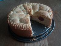 5. Versare la crema fredda, disporre le amarene e ricoprire con un disco ottenuto con l'impasto rimasto, in questo caso il disco dovrà essere leggermente più piccolo della teglia per poter ripiegare i bordi e chiudere la torta.