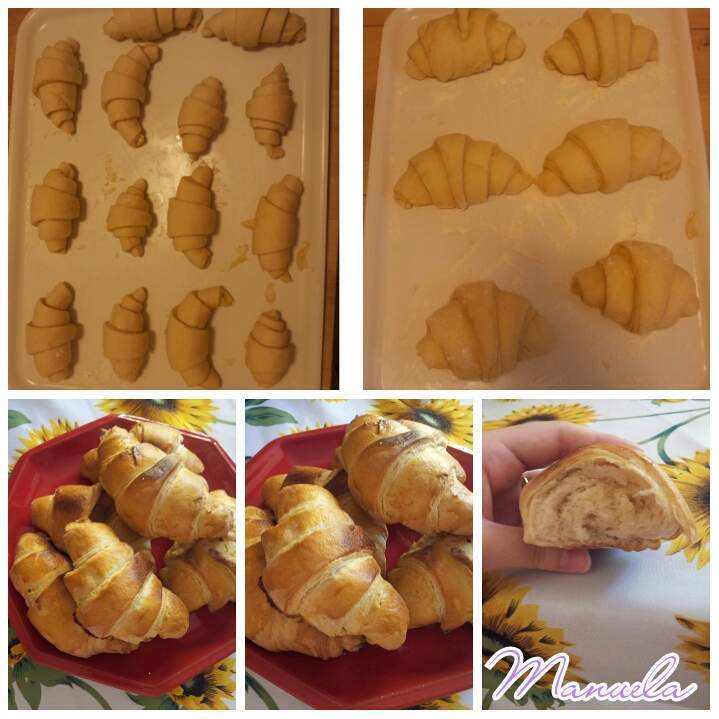 Tagliare 16 spicchi e formare i cornetti arrotolandoli dal lato più lungo verso la punta.