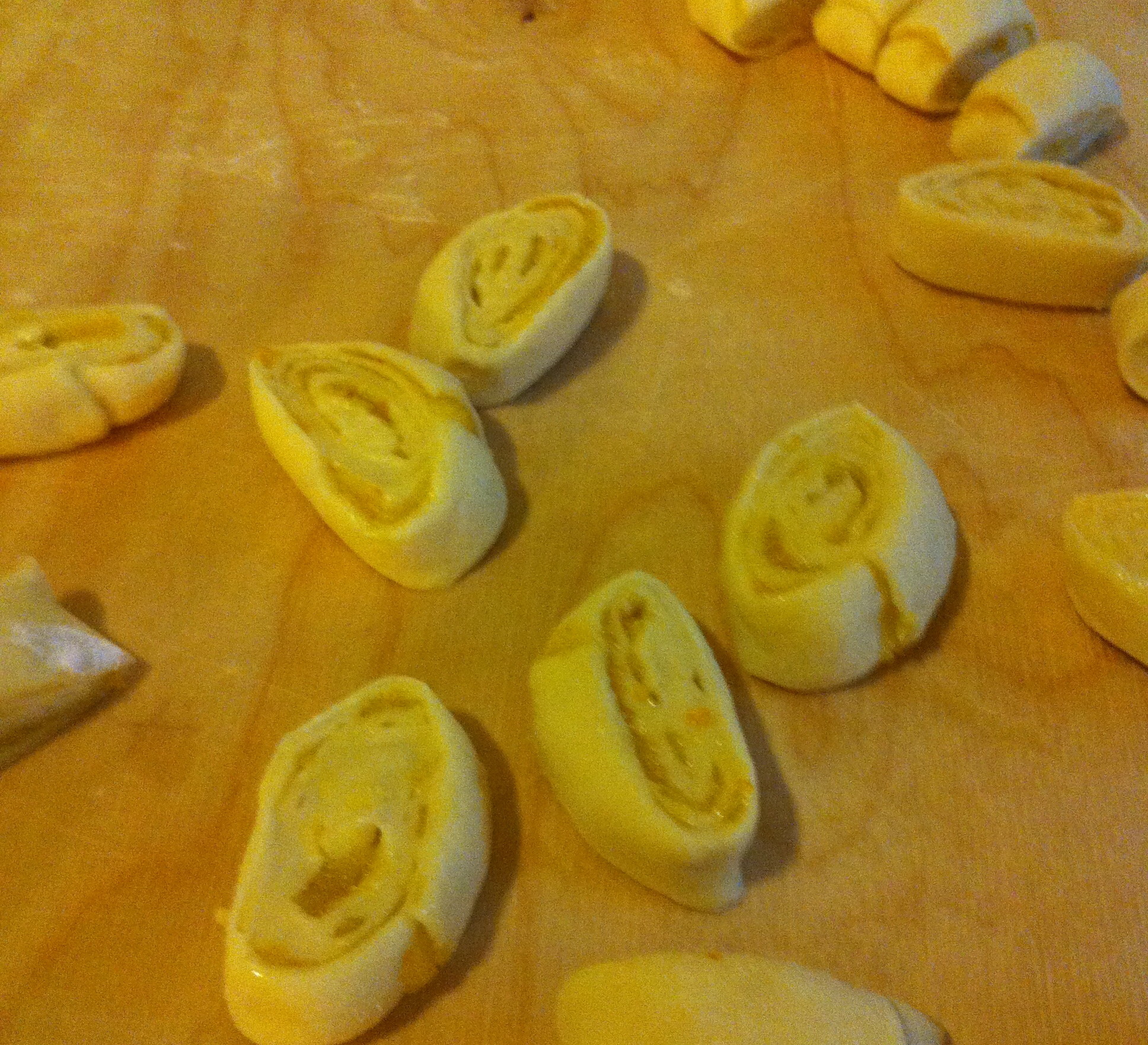 - Arrotolare la sfoglia, non fare più di 4 o 5 giri (meno giri si fanno e più vengono croccanti), tagliare e riarrotolare fino a che la sfoglia sarà terminata;