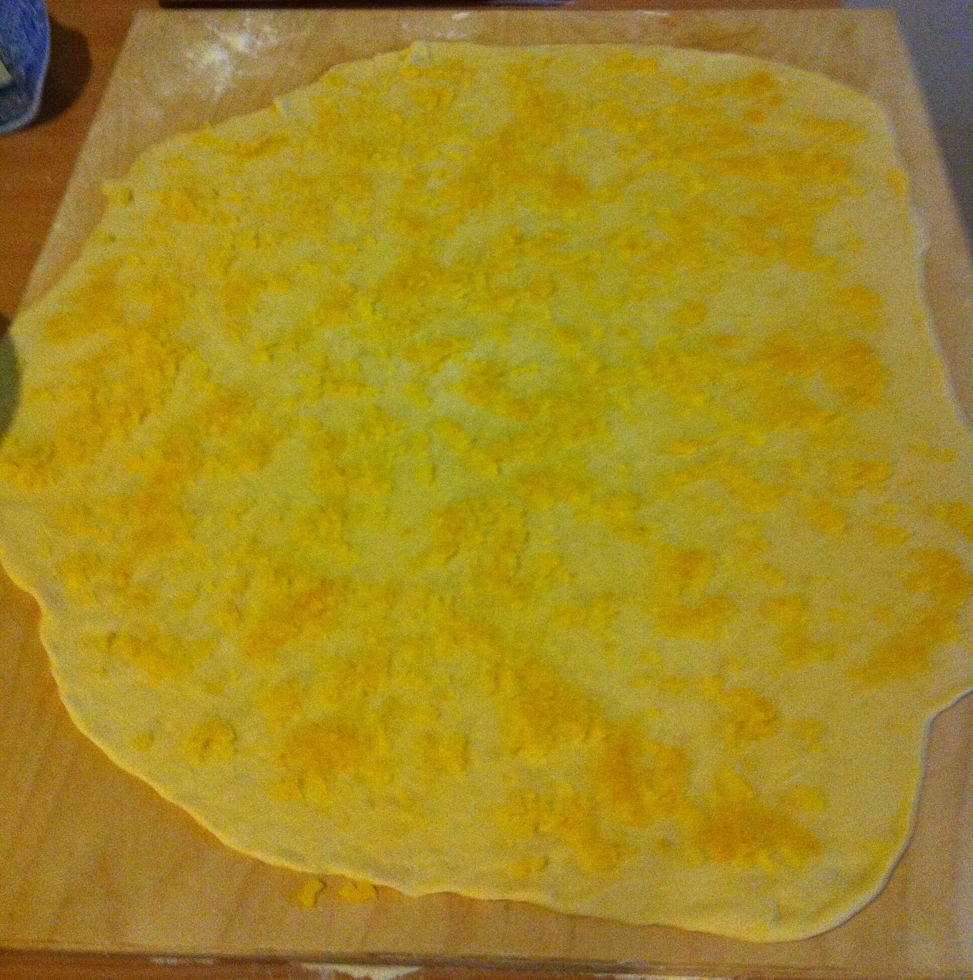 - Prendere metà del composto di arancia, limone e zucchero e spalmarlo sulla superficie della sfoglia;