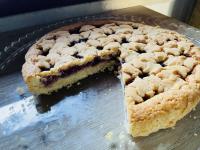 6. Quindi stendere 3/4 dell'impasto tra due fogli di carta da forno, foderare una tortiera da 28 cm, bucherellare con una forchetta, farcire con la marmellata e decorare con strisce di pasta frolla residua!