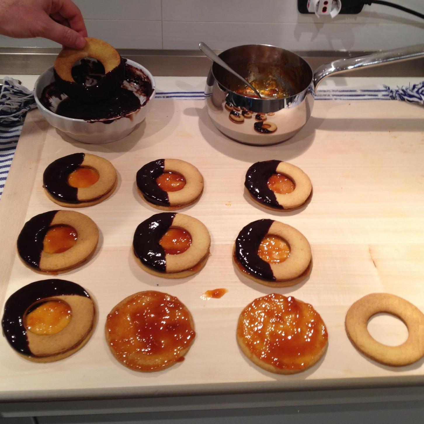 Dopo la cottura porre sul disco senza buco la marmellata; uno strato sottile che permetta di incollare il disco superiore.