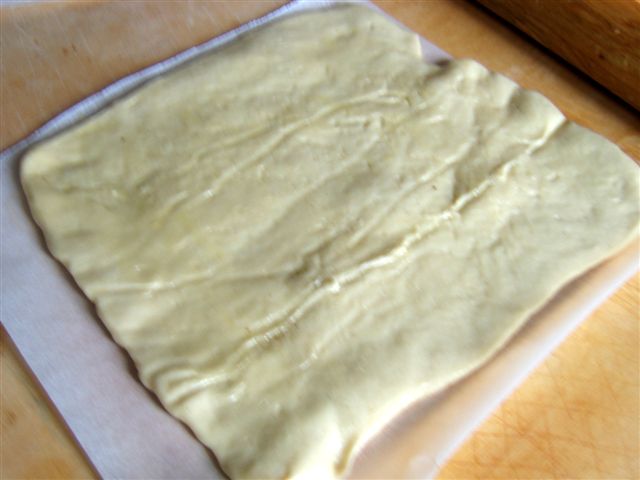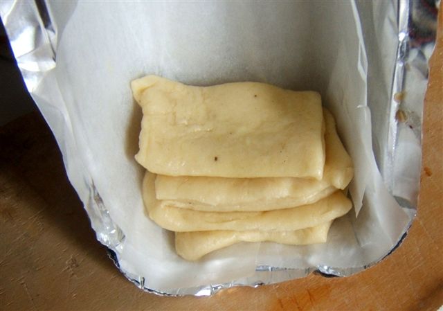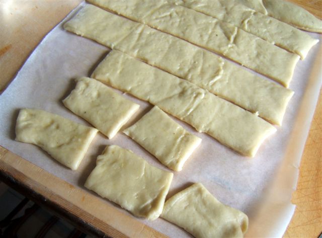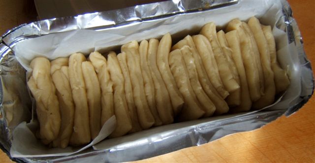 stendere una parte in un rettangolo 35 x 25 spessa 1/2 cm circa, ungerlo con del burro fuso su tutti e due i lati; tagliare il rettangolo in piccoli rettangoli di circa 7 x 5 e metterli uno vicino all'altro (con il lato lungo come base, la superficie contro la parete piccola dello stampo) in un contenitore tipo plum cakes imburrato e infarinato o coperto con carta forno, lasciare lievitare per 2 ore circa .
