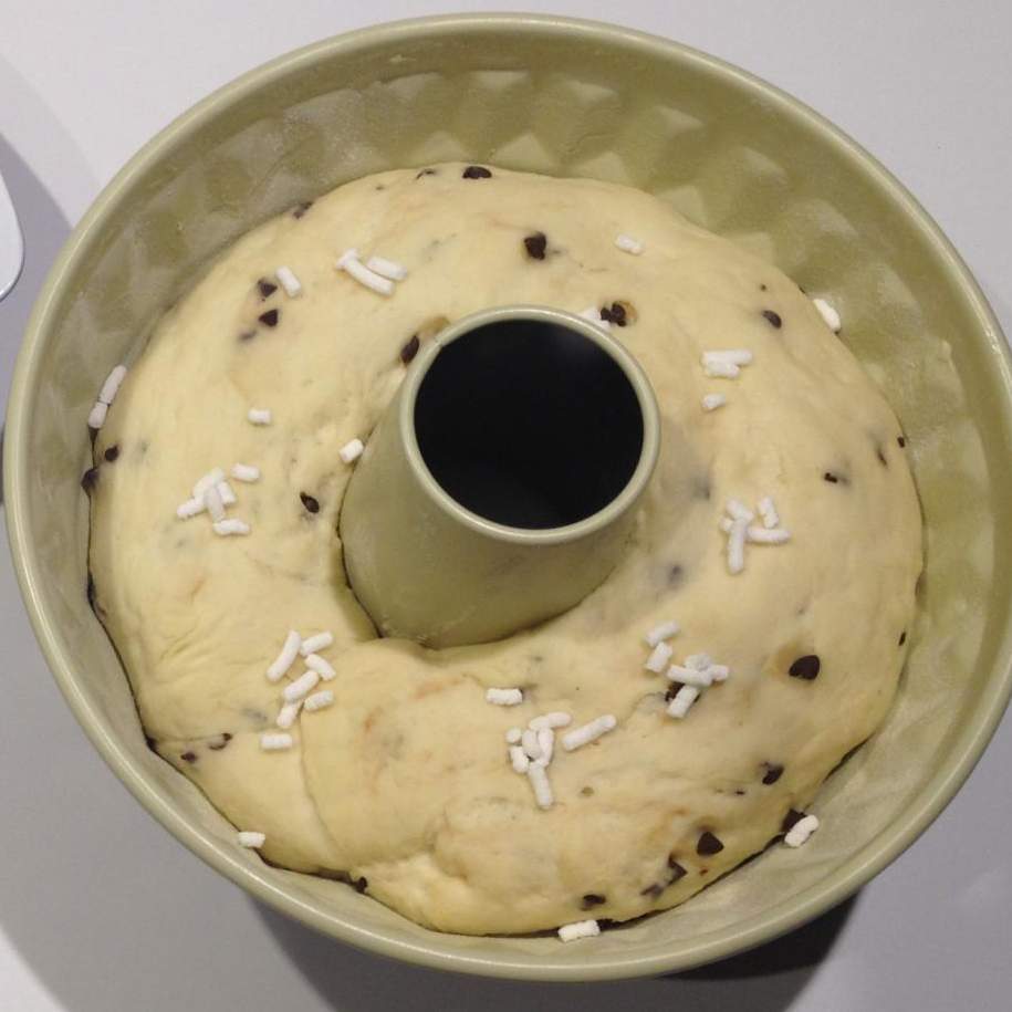 Passato il tempo di lievitazione, l'impasto sarà quasi raddoppiato di volume, metterlo su una spianatoia e impasare a mano, incorporando a poco a poco le gocce di cioccolato.