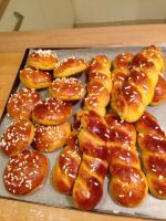 Aggiungo un paio di considerazioni.Effettivamente nella spiegazione manca il passaggio dello zucchero, io l'ho aggiunto insieme alla farina, tutta 00.A proposito della farina, io i 550gr della ricetta li ho usati tutti , anzi anche un pochino di più.Riguardo la lievitazione: ho lasciato lievitare l'impasto intero circa una mezz'oretta e poi circa 3 ore dopo averlo porzionato ( piccoli panini e treccine )Fatti e usciti mi pare abbastanza bene. Chiedo però alcuni chiarimenti: quando va messo lo zucchero ? mi sono accorta che manca il passaggio quando stavo già mettendo la farina, ma forse è meglio metterlo con il lievito ?Che tipo di farina consigli ? Io ho usato metà 0 e metà 00. Quando si aggiunge la farina si mescola 10 sec. vel.5 poi si controlla se ne serve altra e poi si mette il burro altri 10 sec. vel.5, giusto ? E infine, una volta formati i panini bisogna lasciarli lievitare ancora ? Io li ho lasciati lí giusto il tempo che si scaldasse il forno...