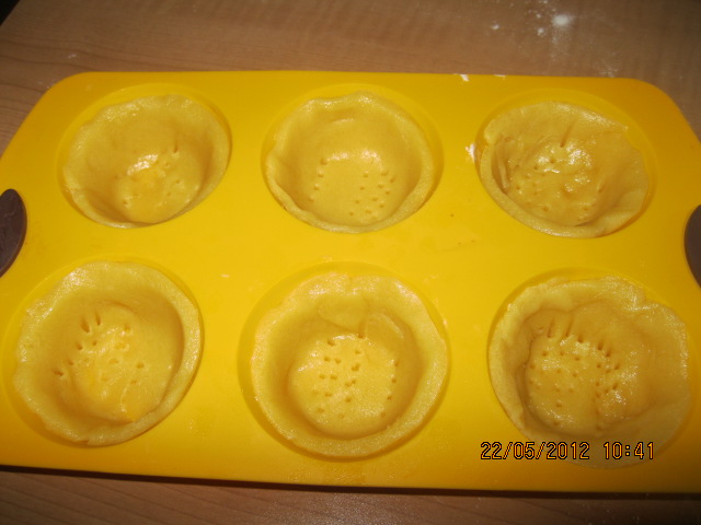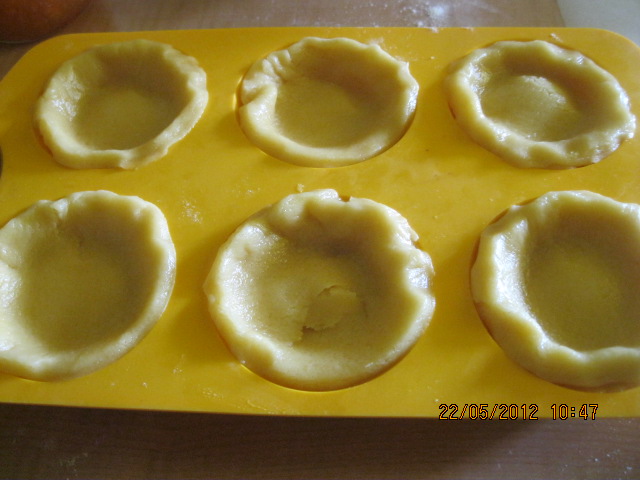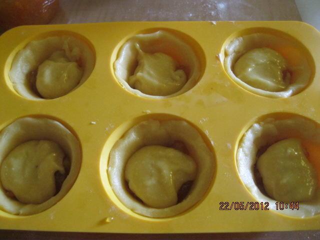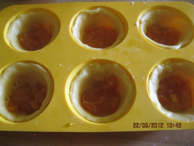 Preparare la pasta frolla e mettere in frigor.Stendere la sfoglia non troppo sottile e con questa ricoprire lo stampo da pasticcini ( oppure usare i pirottini di carta).Bucherellare il fondo con i rebbi della forchetta e inserire un bel cucchiaio di marmellata. Per la farcia, inserire nel