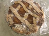 Preriscaldare il forno a 170°C. Imburrare e infarinare due teglie in alluminio (Ø 20 cm). Dividete in due la pasta frolla. Sistemare un pezzo di pasta frolla tra 2 fogli di carta forno e con un matterello stenderla ad uno spessore di 4-5 mm. Eliminare il foglio di carta forno superiore, adagiare la teglia sulla pasta stesa e capovolgere il tutto con l'aiuto delle mani. Far aderire l'impasto alla teglia ed eliminare il foglio di carta forno. Con un coltellino a lama liscia ritagliare i bordi a filo con lo stampo e bucherellare il fondo con i rebbi di una forchetta. Fate altrettando con l'altra frolla. Trasferire il ripieno preparato su entrambe le teglie foderate con la frolla. Reimpastare la pasta frolla rimasta e stenderla ad uno spessore di 2-3 mm, ricavare delle strisce larghe circa 1,5 cm e formare il classico reticolato decorativo sulla superficie della pastiera. Cuocere in forno caldo per circa 1h e 20 minuti (170°C). Lasciandola in forno spento e portellone aperto per altri 20 minuti prima di togliere dal forno.Lasciate riposare per un giorno prima di servire.
