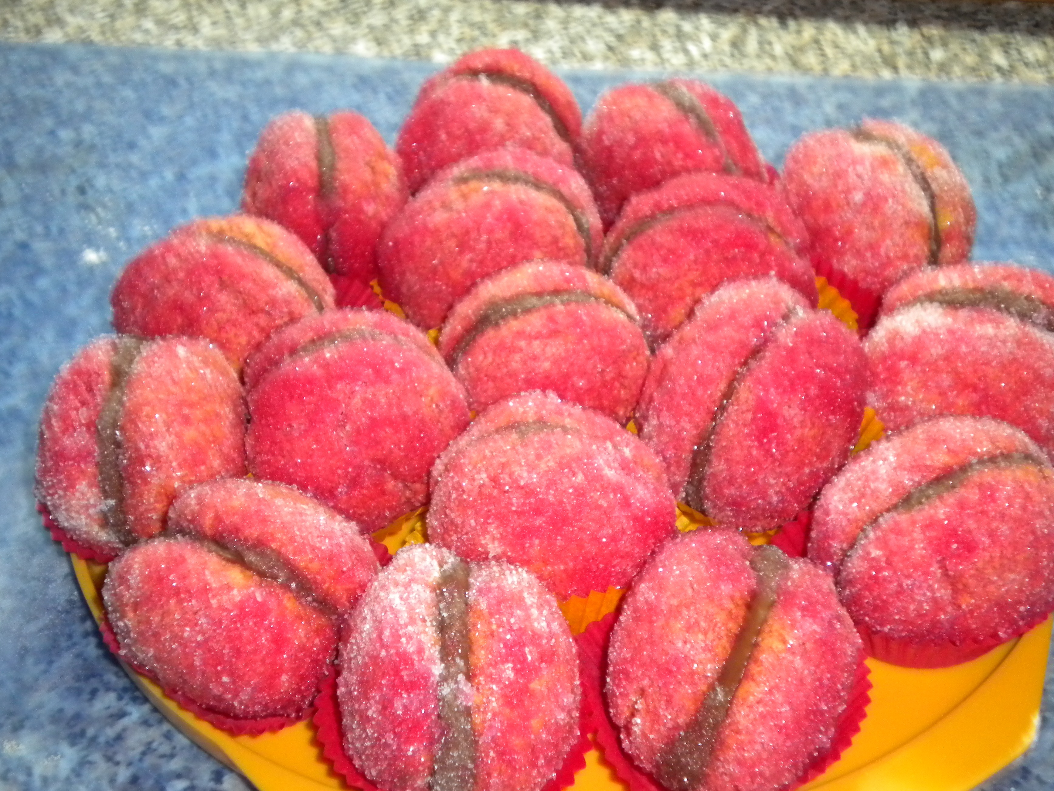 "velocità spiga" . Formare con l'impasto delle palline di circa 25 gr (il peso può variare in base alle preferenze se si vogliono delle mini pesche farle di 10-15 gr) quindi adagiarle sulla placca foderata di carta forno, schiacciarle leggermente ed infornare a 180° per circa 10-15 min. Quando sono fredde accoppiarle con la nutella. Fare una bagna con metà alchermes e metà acqua (chi è amante del liquore può usare solo alchermes). Passare le pesche nella bagna e poi nello zucchero semolato. Buon appettito!!!!