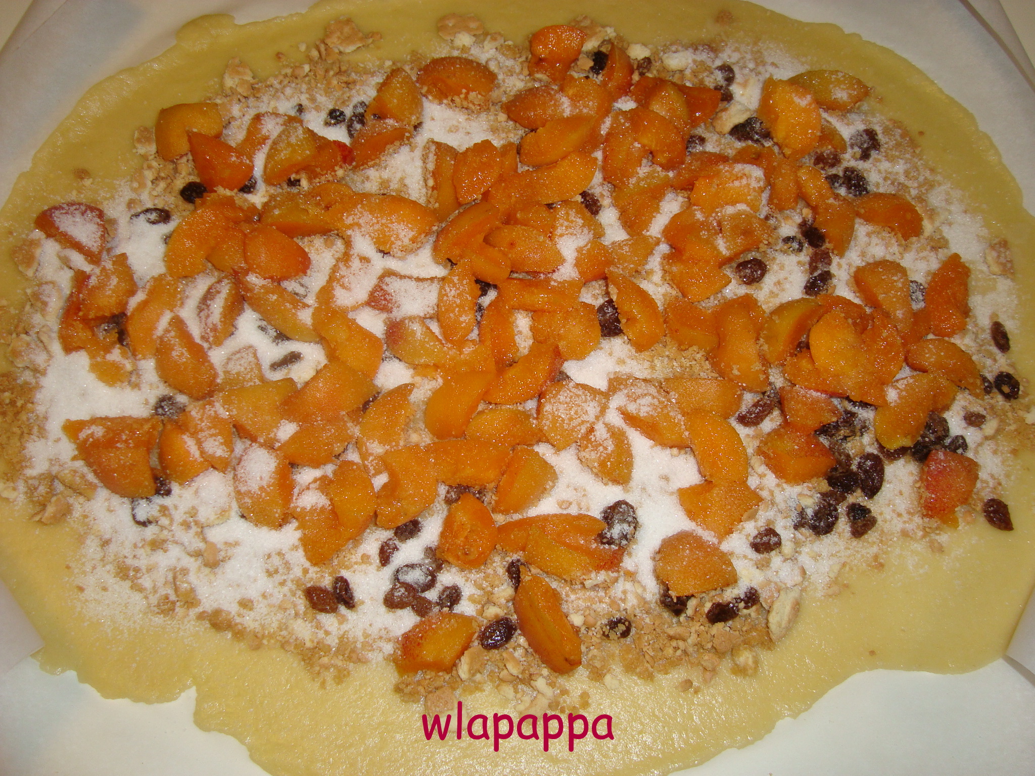 Con l'aiuto di 2 fogli di carta forno stendere la pasta formando un rettangolo, cospargere con il miscuglio di pangrattato e biscotti , aggiungere l'uvetta strizzata, le albicocche e 4 cucchiai di zucchero. Sempre con l'aiuto della carta forno arrotolare la pasta sul ripieno, chiudere bene le estremita' e praticare dei tagli obliqui sulla superficie.