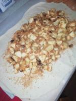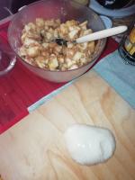 - Sbucciare e tagliare le mele a fettine sottili, amalgamarle in un recipiente con la marmellata, aggiungere il pan di spagna, i pinoli, il burro ammorbidito, il rum, l'uvatta ben strizzata, la scoza di limone, lo zucchero, la cannella, amalgamando il tutto per bene ogni volta che si aggiunge un ingrediente, lasciare riposare;