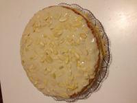 Tritare grossolanamente le mandorle pochi sec. a vel.7 e tenere da parte.4. Fare due tagli al pan di spagna e ottenere 3 dischi, bagnarli con il latte dimandorla e versare la crema (tenendone un po' da parte per la superficie).Richiudere la torta e ricoprire con la crema rimasta mettendone anche ai bordilaterali.Ricoprire con la granella di mandorle la superficie e i bordi.