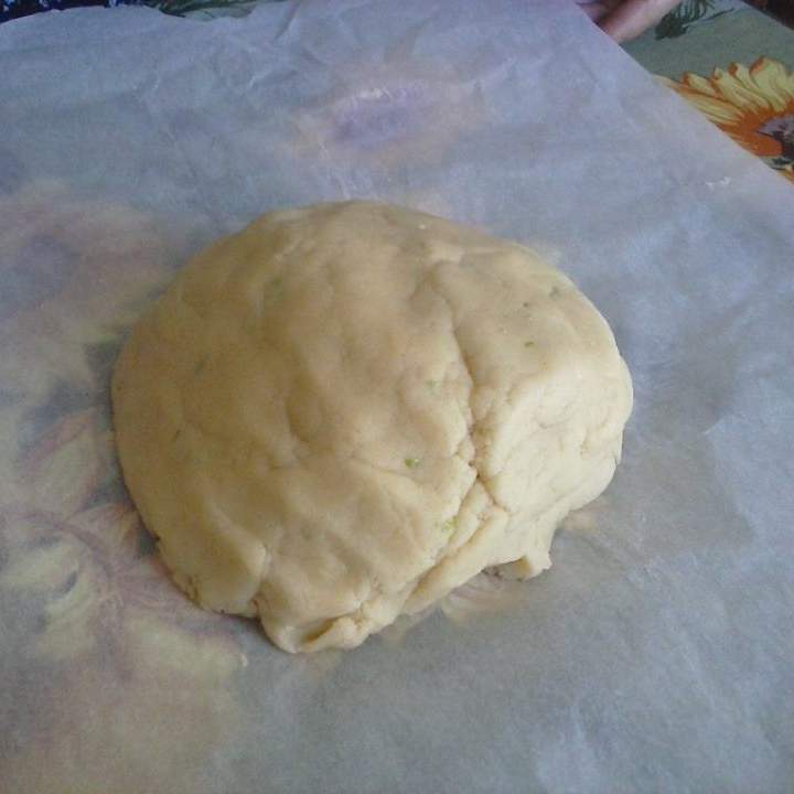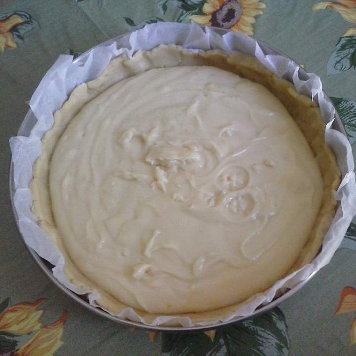 Composizione crostata: dividere la pasta frolla in due panetti, uno leggermente più grande che varrà usato per la base. Stendere il panetto più grande su carta forno e metterlo nella tortiera avendo cura di creare dei bordi. Versare la crema.