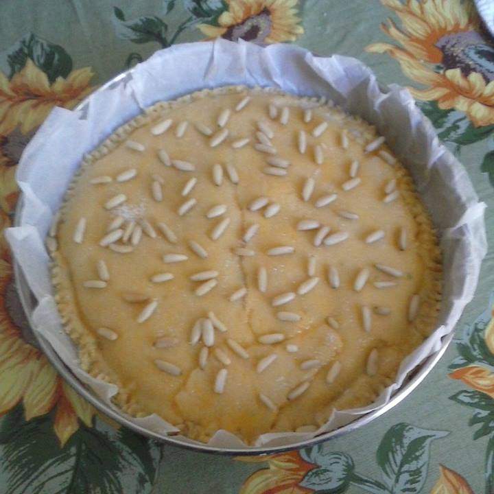 Stendere la restante pasta aiutandosi sempre con carta forno e coprire la torta. Spennallarla con un tuorlo ecospargere lo zucchero semolato e i pinoli. Infornare a 180° in forno preriscalto per 30-40 minuti.