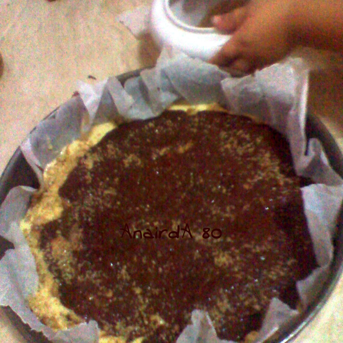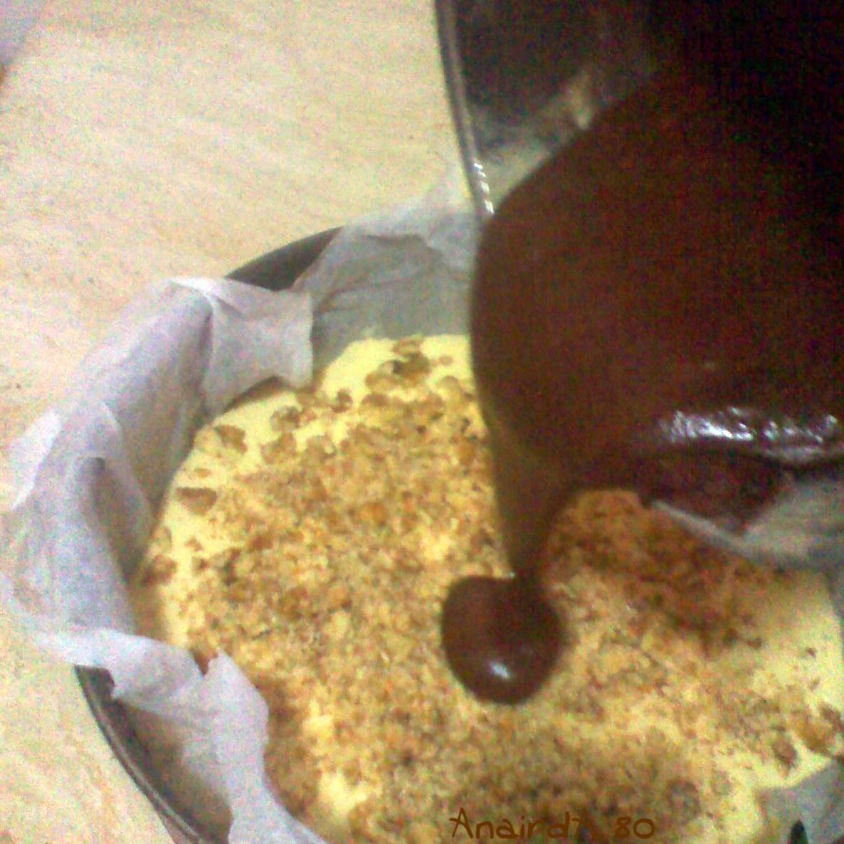 Versare circa la metà del composto nella teglia, cospargere le noci e nell'impasto nel