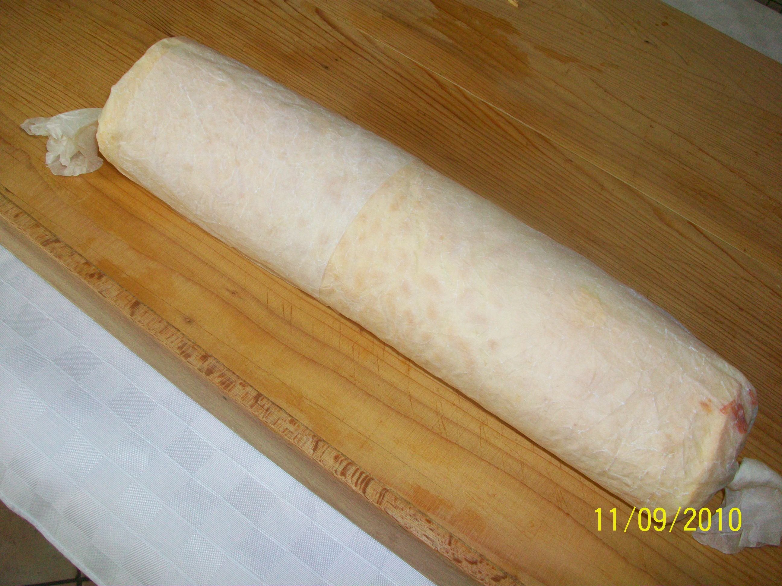 - Aiutandosi con la carta forno fare il rotolo dal lato più lungo (37 cm.) cercando di non far fuoriuscire il ripieno, incartarlo e chiuderlo a caramella, lasciar raffreddare per 30 m.