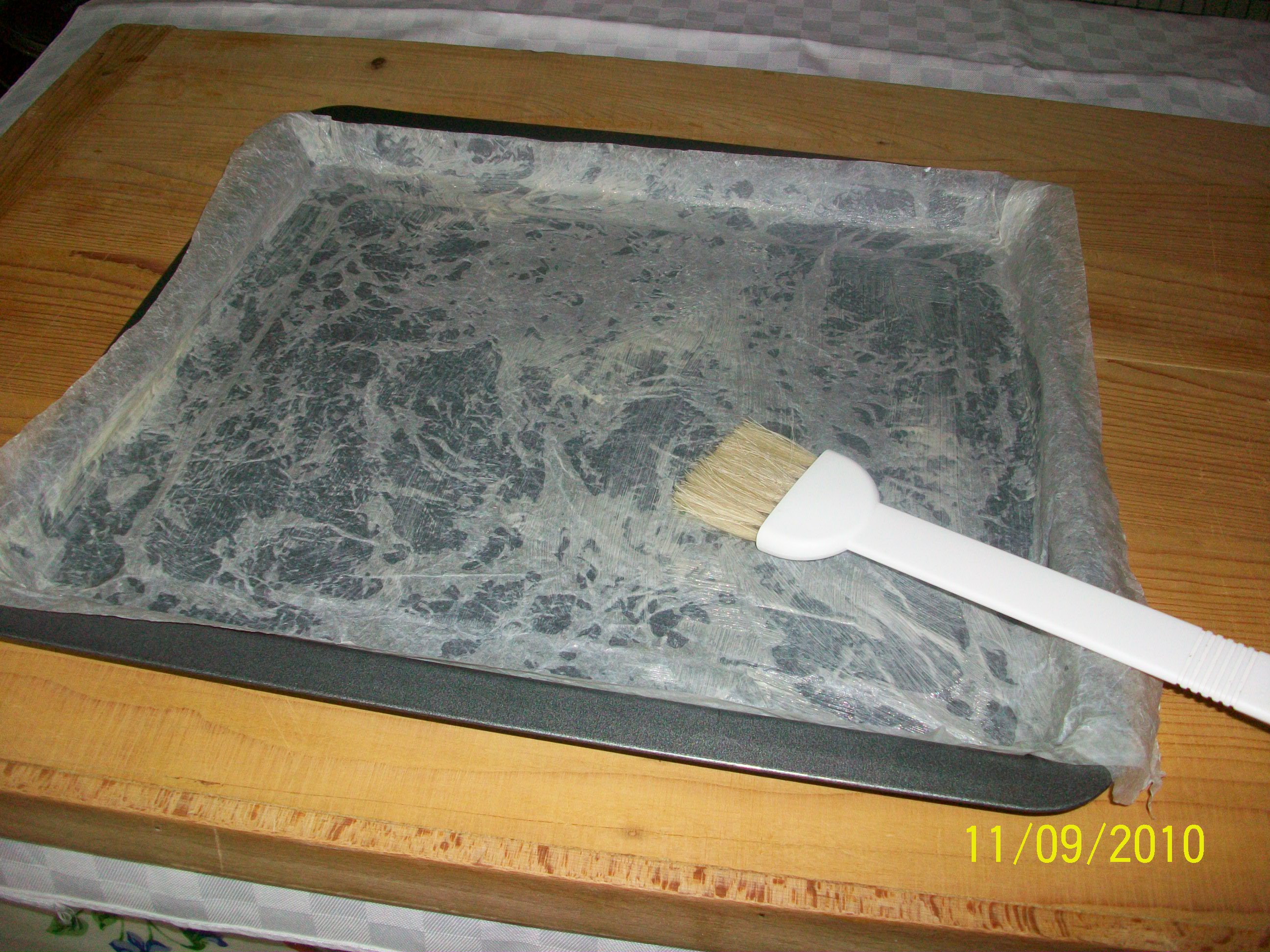 - Foderare la teglia rettangolare con carta forno bagnata, strizzata e pennellata con burro morbidissimo o fuso.