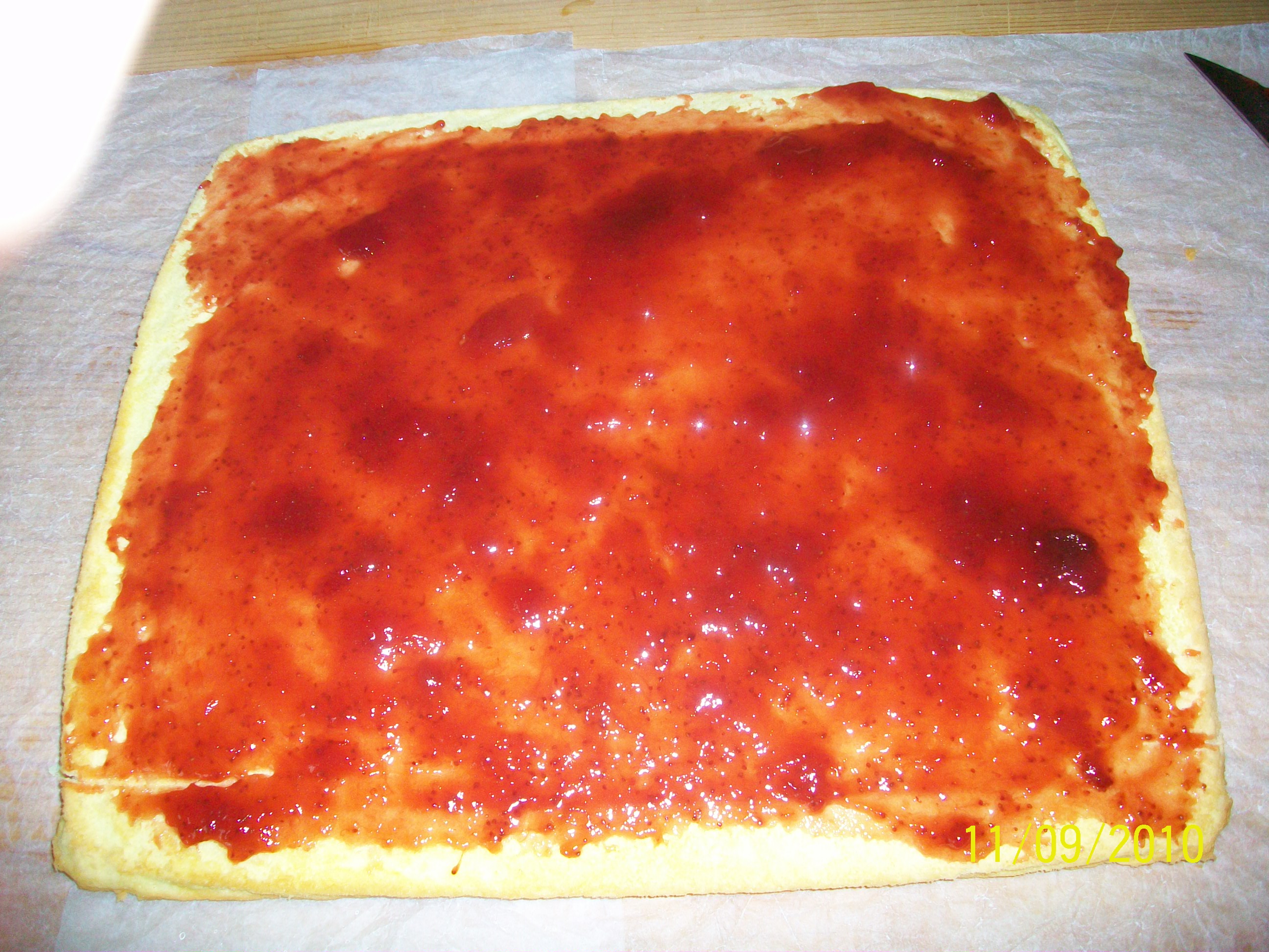 - Sfornare la base del rotolo capovolgendo la teglia sulla carta forno preparata, togliere la carta della cottura e subito spalmarvi sopra la marmellata.