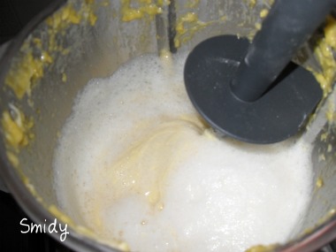 "coperchio chiuso" (non lavato) lavorate i tuorli con lo zucchero semolato per 2' a velocità 6.Aggiungete il burro fuso (raffreddato) e lavorate 20'' a velocità 6.