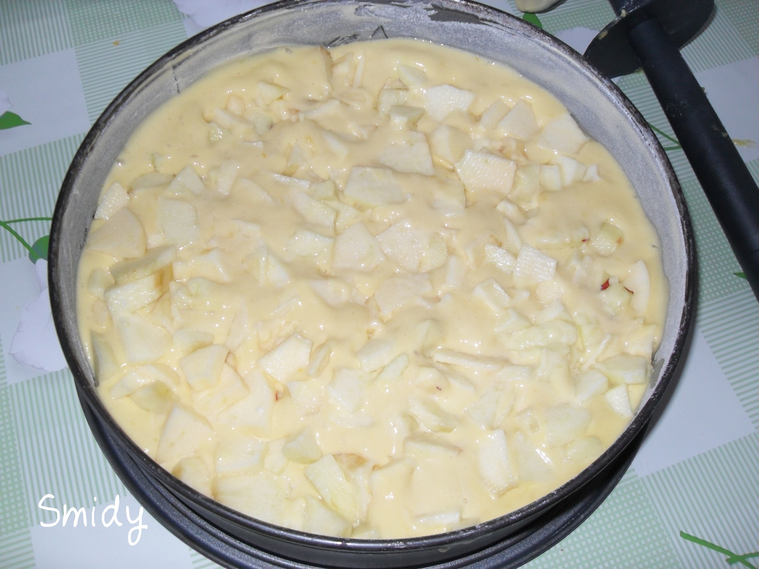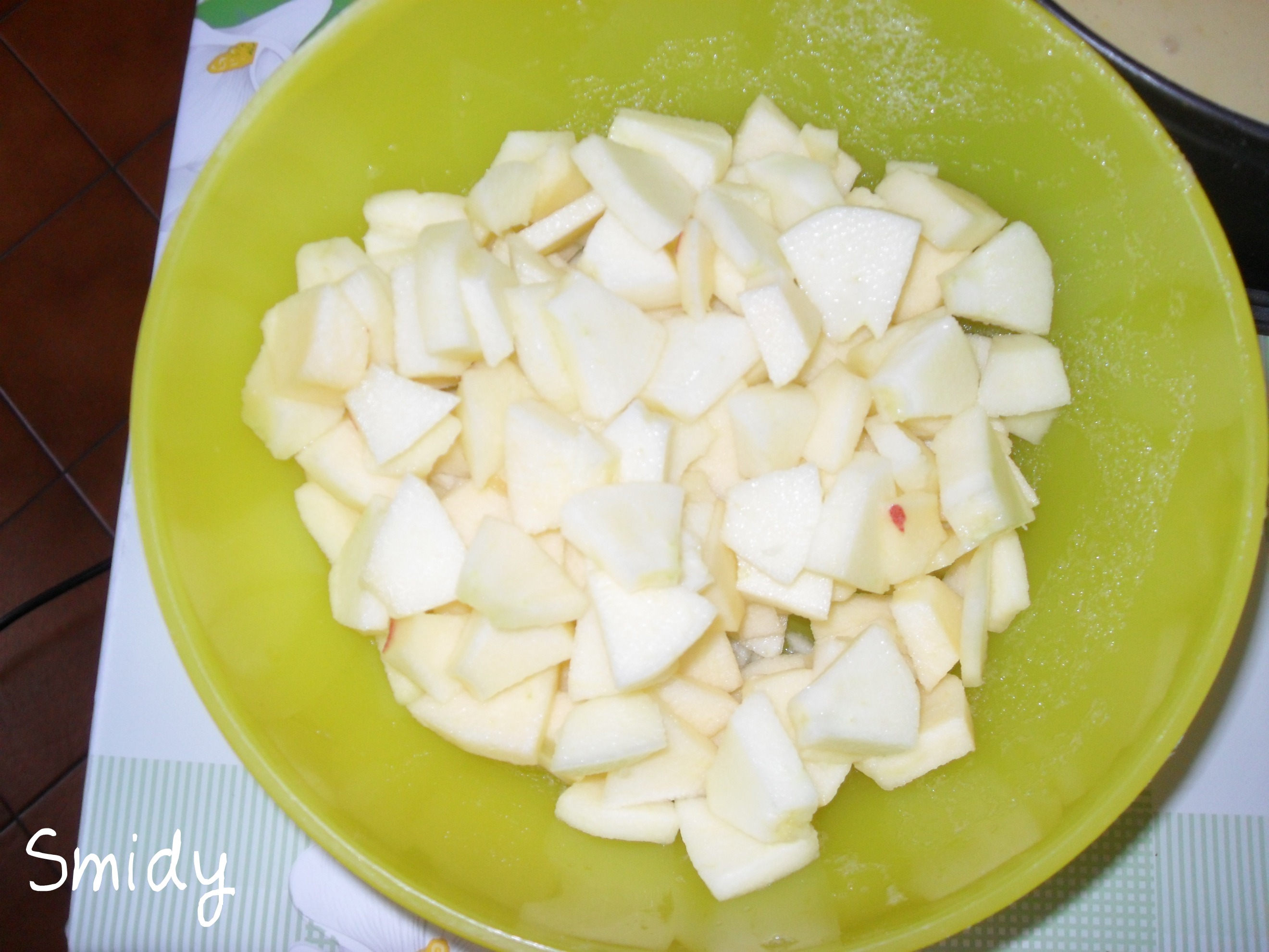 Sbucciate le mele, tagliatele a cubetti e affondatele nell'impasto.
