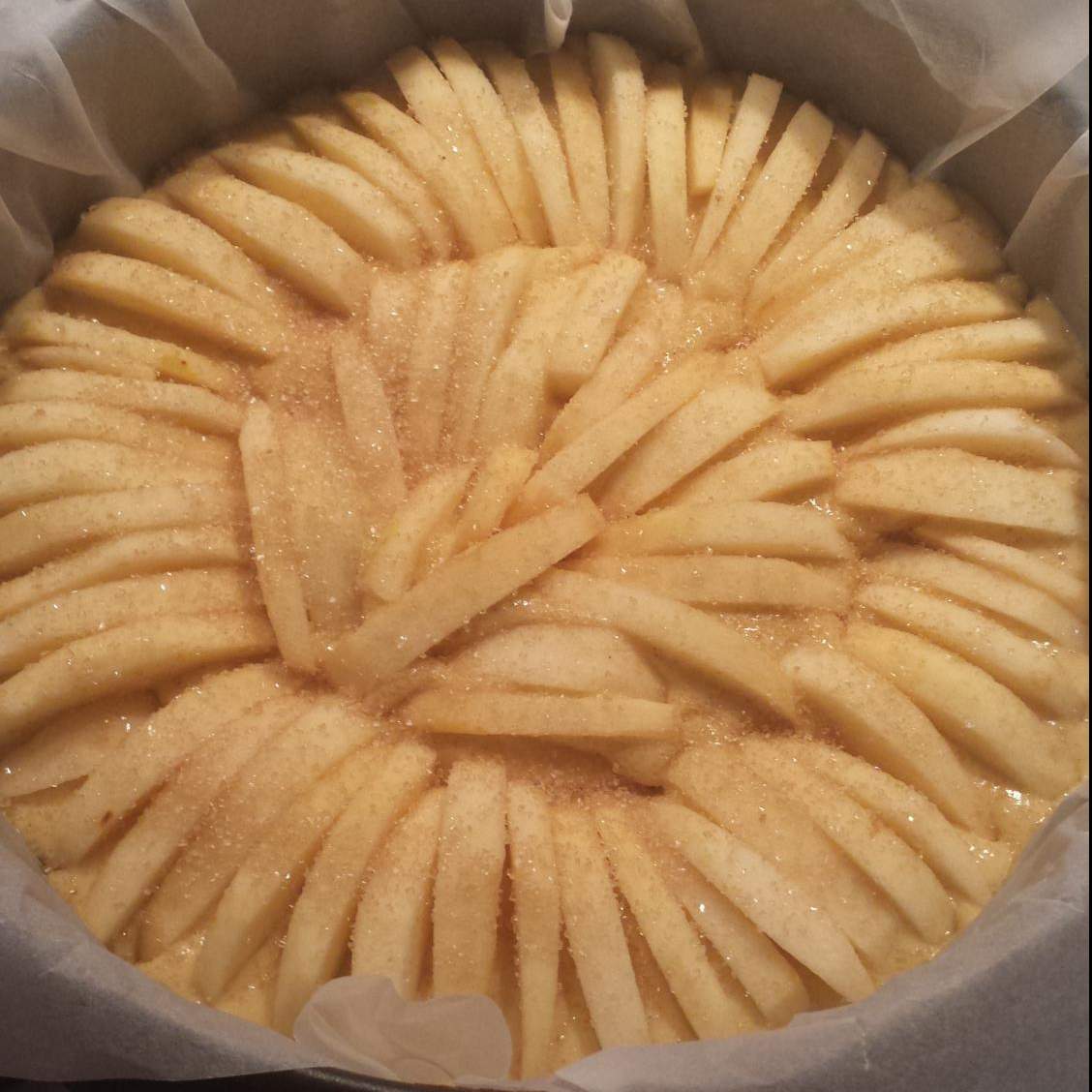 "coperchio chiuso" inserire le mandorle e tritare 10 secondi velocità 10. Mettere da parte. Inserire la farfalla, uova e zucchero. Azionare a vel. 4 per 5 minuti a 37°. Togliere la farfalla e unire burro fuso e yogurt: 1 minuto velocità 5. Unire la farina 00 setacciata con il lievito, la farina di mandorle e il liquore. Mescolare per 1 minuto a vel. 5. Versare il composto in una tortiera ricoperta di carta da forno livellando bene il composto. Farvi affondare le fettine di mela, tenendole in posizione verticale. Spolverizzare la superficie con un altro cucchiaio di zucchero di canna. Infornare a 180° per 40 minuti circa.