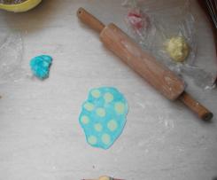 - Stendere un po' di pasta blu e con la gialla fare tante palline, adagiarle sulla pasta blu e schiacciate con il mattarello così da ottenere dei pois: con questo fare il papillon;