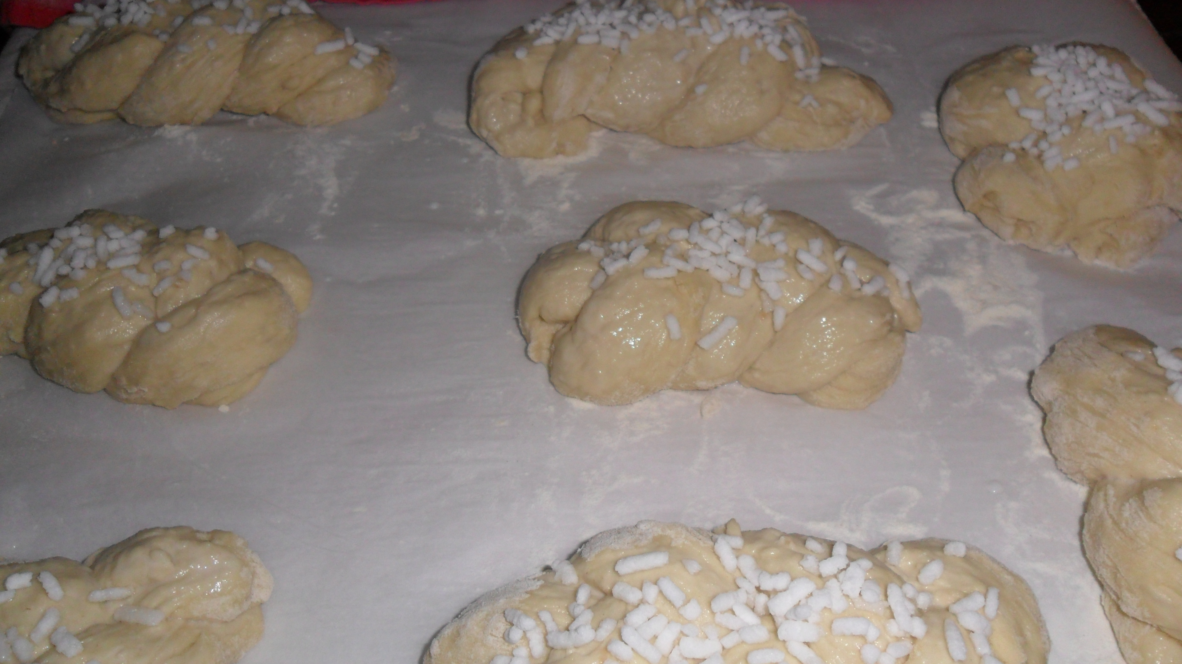 Recuperare l'impasto, che nel frattempo si sara' gonfiato, e dividerlo in panetti. Io ne ho fatti 8, ma sono usciti un po' grossi. Quindi direi almeno una decina. Dividere ogni panetto in 3 cilindri e intrecciarli fra loro per formare delle trecce. Metterle sulla teglia del forno ben distanziate, coprirle col telo e farle lievitare per almeno mezz'ora.