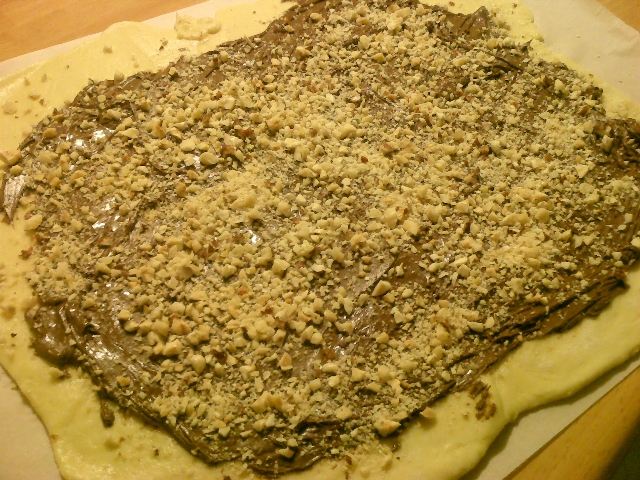 "velocità spiga" . Tira fuori l'impasto, se risulta un po' appiccicoso aggiungi un po' di farina, stendi l'impasto tra 2 fogli di carta da forno, spalma con la nutella e cospargi con le nocciole titate, arrotola come un salame e con la stessa carta da forno mettilo in uno stampo da plum-cake , metti in forno preriscaldato a 180° per 40 minuti circa, sforna , fai raffreddare bene e spolvera con zucchero a velo.