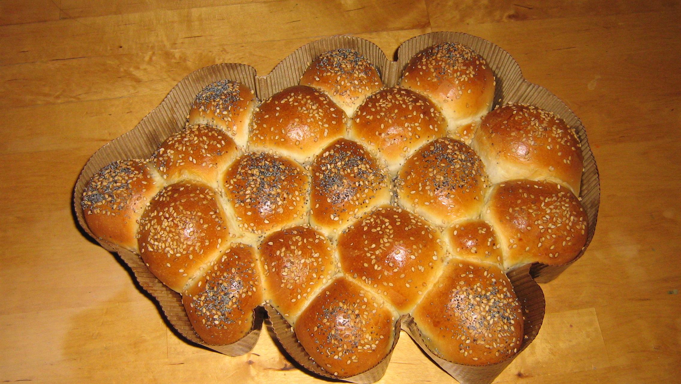 Fate rilievitare finchè non si sono ben riempiti tutti gli spazi liberi e pennellate la superficie con un tuorlo sbattuto con un goccio d’acqua; mettete i semini di sesamo, di papavero ecc.. Cuocete in forno a 180° finchè non sarà dorato, circa 15/20 minuti, dipende dal forno.