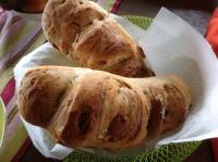 "velocità spiga" .mettere a riposo in forno spento sino al raddoppio del volume quindi dividere in 3 parti, fare con ognuno un un filoncino facendo espellere l‘aria con i palmi, ripetere l’operazione per altre 2 volte cambiando sempre il senso come per la pasta sfoglia, al penultimo passaggio distribuire le noci, lasciare lievitare coperti per circa 20 minuti