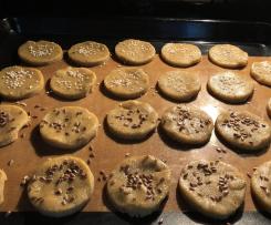 Togliere l'impasto dal frigorifero, staccandone un pezzetto alla volta stenderlo con il matterello (circa 5 mm) e con un coppapasta ricavare delle forme rotonde di circa 5 cm. - Mettere i biscotti sulla teglia da forno ricoperta di carta forno, ricoprirli con i semi (se graditi) e cuocerli per circa 15 min.