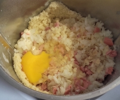 "coperchio chiuso" farina di riso, Fioretto, burro, zucchero e sale 25 Sec. Vel. 4. - Aggiungere wurstel, patate, cipolla, pepe e uovo 20 Sec.