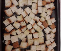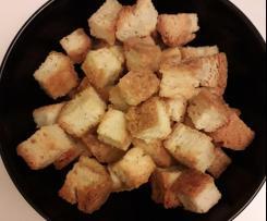 - Disporre i cubetti di pane su una placca da forno, a piacere aggiungere sale, pepe, olio;