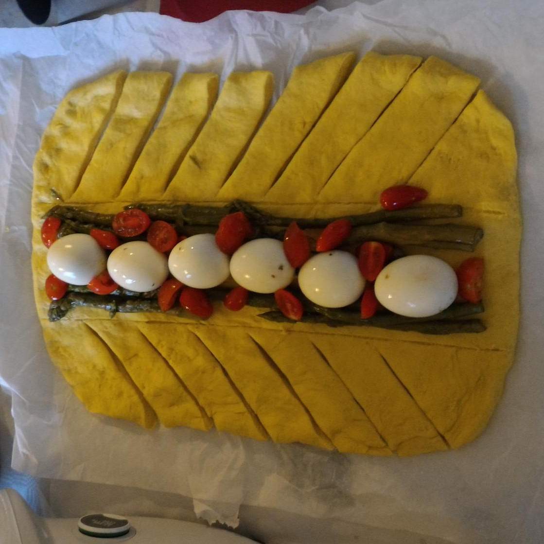 1. Preparare l'impasto del Panbrioche come da ricettario base 2. Stendere l'impasto e dare una forma rettangolare, dividerlo in tre parti uguali per la lunghezza (ma senza tagliarlo). Nelle due parti laterali con un coltello fare delle incisioni a lisca di pesce. 3. Nella parte centrale posizionare gli asparagi, i pomodorini e le uova sode. il sale e il pepe. 4. Formare la treccia, spennellare la superficie con il tuorlo e il latte 5. Cuocere in forno a 200° per 15/20 minuti