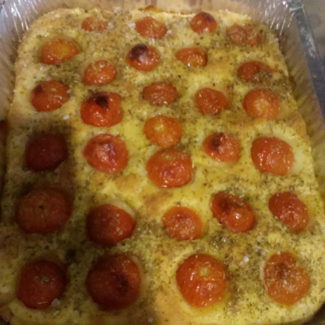 Taglia a metà i pomodrini e posizionarli su tutta la superficie della focaccia esercitandovi un po di pressione. Condire con una spolverata di origano e il sale grosso. Se la vedete asciuta mettere un filo d'olio.