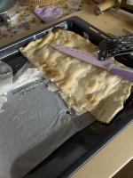 6. Ricoprire la sfoglia con dei pezzetti di crescenza avendo cura di lasciare uno spazio sui bordi.