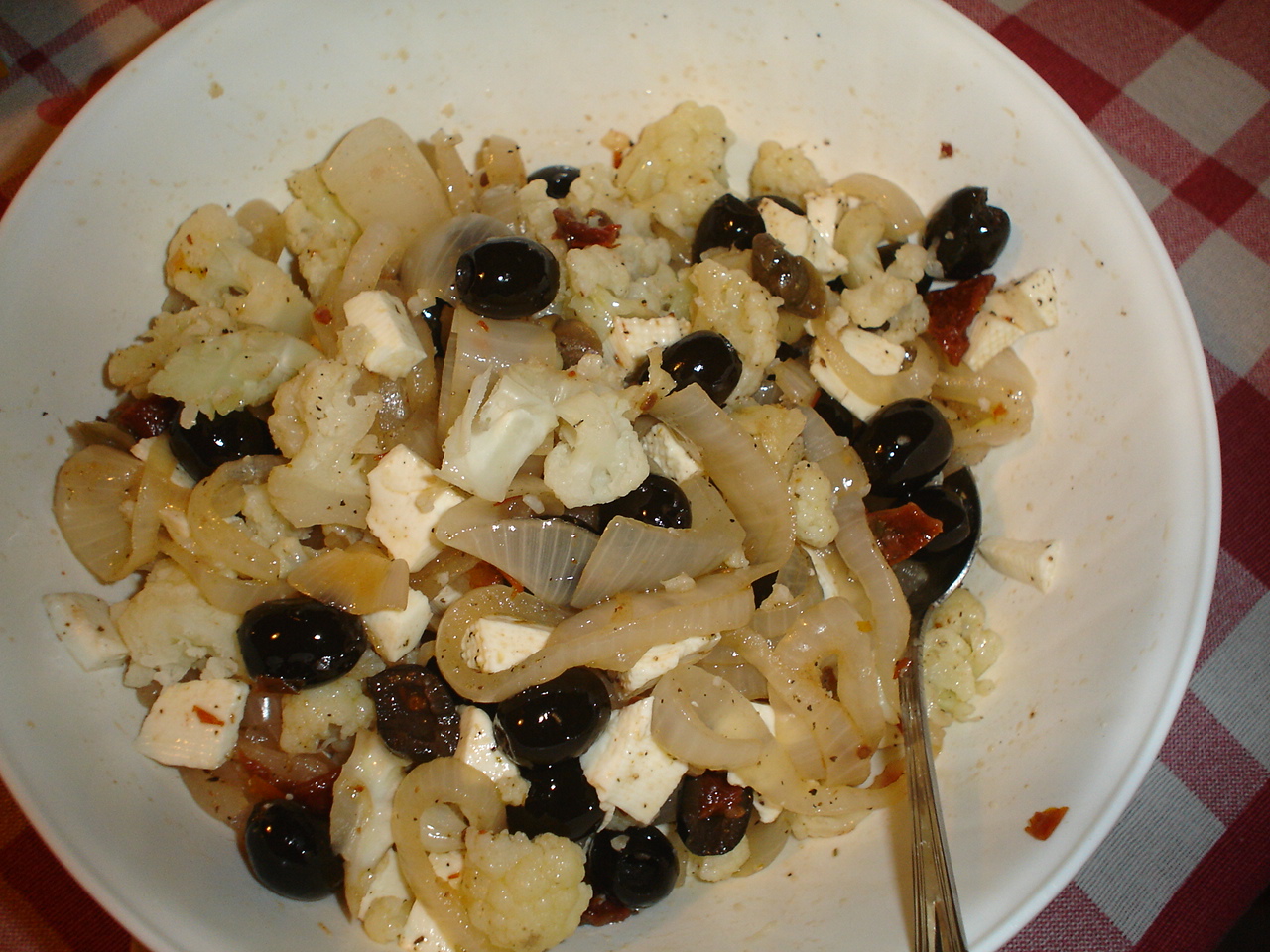 Affettare le cipolle sottilmente ma NON a velo, sbollentarle in acqua salata in una pentola per una decina di minuti. Devono ammorbidire ma non sfaldarsi.Scolarle e porle ancora calde in una ciotola con le olive nere, i capperi dissalati, i pomodorini secchi tagliati a pezzettini, le cimette di cavolfiore tagliate a pezzetti, l'origano, il pepe e l'olio, e mescolare delicatamente ma ripetutamente. Lasciare intiepidire bene. Tagliare il primosale a pezzetti e unirlo alla farcia.